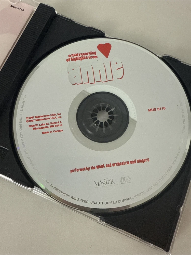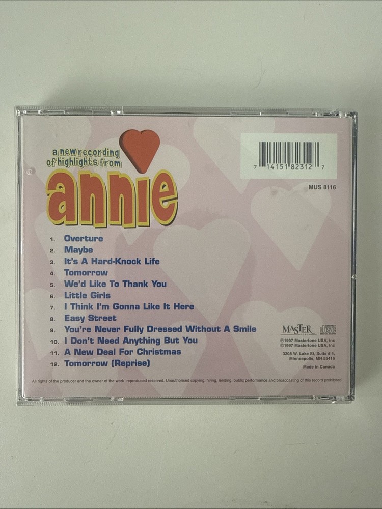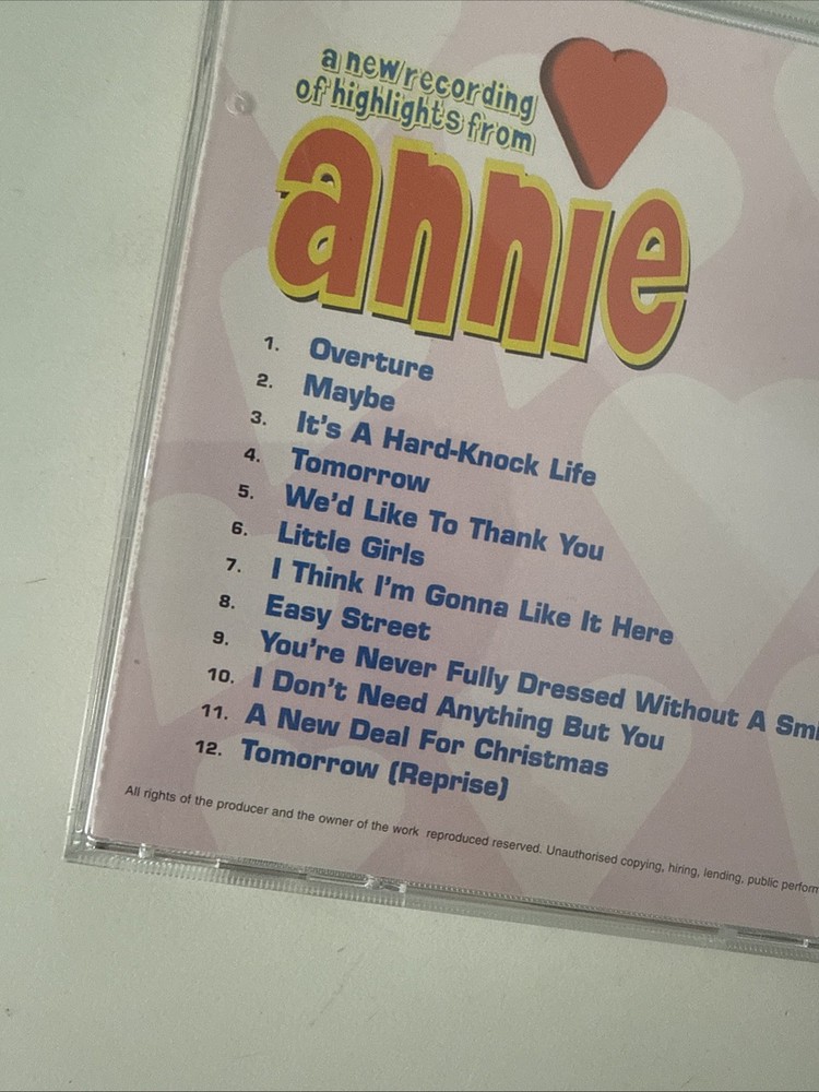 Delve into the beloved world of "Annie" with this new CD, featuring a compilation of highlights from the iconic West End production. Showcasing the talents of various artists, this album brings the vibrant energy of the live orchestra and vocalists straight to your audio player. The CD format ensures high-quality sound, allowing you to experience the stirring melodies and catchy tunes that have charmed audiences for generations. Whether you're a long-time fan or discovering these timeless tracks for the first time, this collection is a delightful addition to any music lover's library.