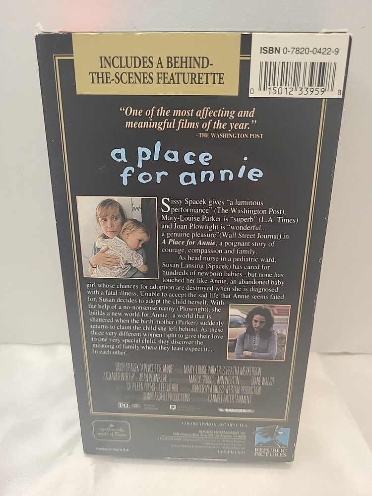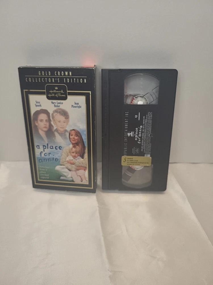 A Place For Annie Hallmark Gold Crown Collector's Edition VHS Sissy Spacek. There is some wear and tear to the edges and corners of the slipcover but for its age its in very good condition. Please see photos for more information on condition. Thank you for viewing and we look forward to hearing from you soon!!
