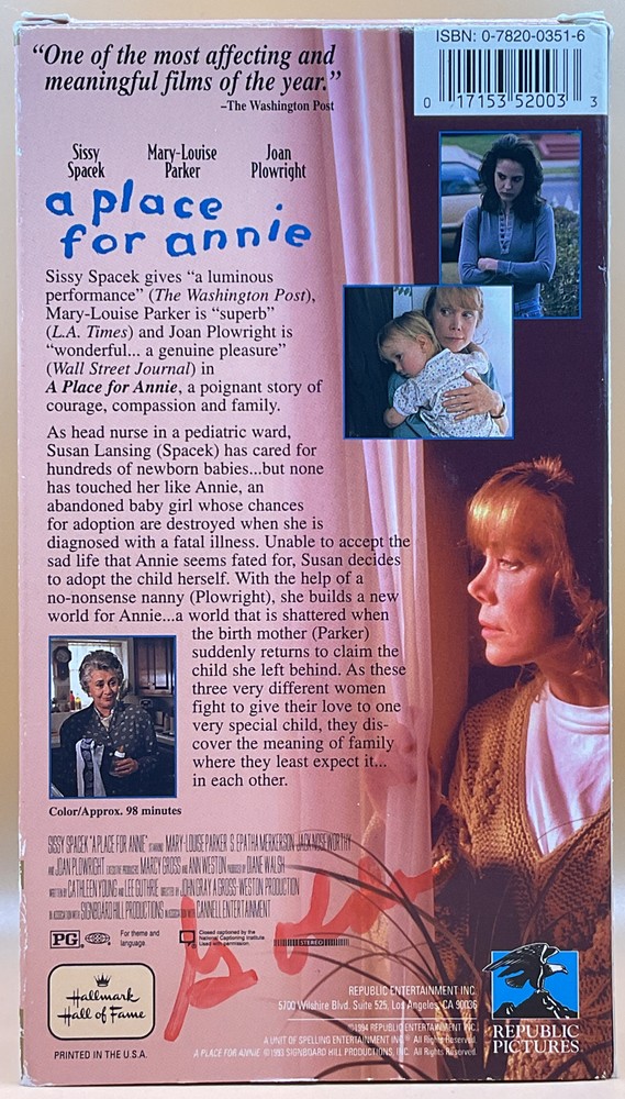 A Place for Annie VHS 1994 Sissy Spacek **Buy 2 Get 1 Free** $4.99 shipping for first video, .50 each additional, free shipping on orders over $100. Buy 2 VHS/DVD $25 & under get one free, no limit. All VHS are tested and rewound before shipping, and are visually inspected for mold before listing. You receive the exact video collectible as pictured here. Thank you. Ruby