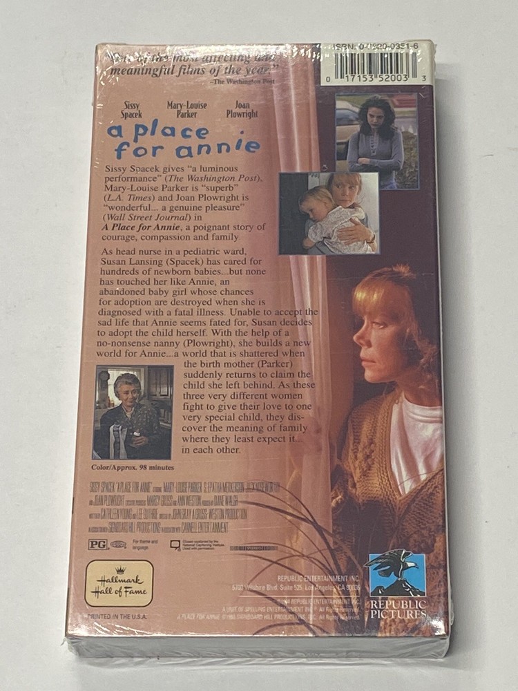 This VHS tape features the critically acclaimed drama "A Place for Annie" directed by John Gray and starring Sissy Spacek. The film is rated PG and is in the NTSC signal standard. It was released in 1994 and falls under the "Movies & TV" and "VHS Tapes" categories. The genre of the film is drama and it features a talented cast and crew. This VHS tape is a great addition to any movie collection and is sure to provide hours of entertainment. Get your hands on this classic film today! B-3
