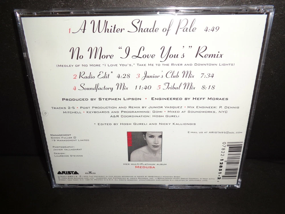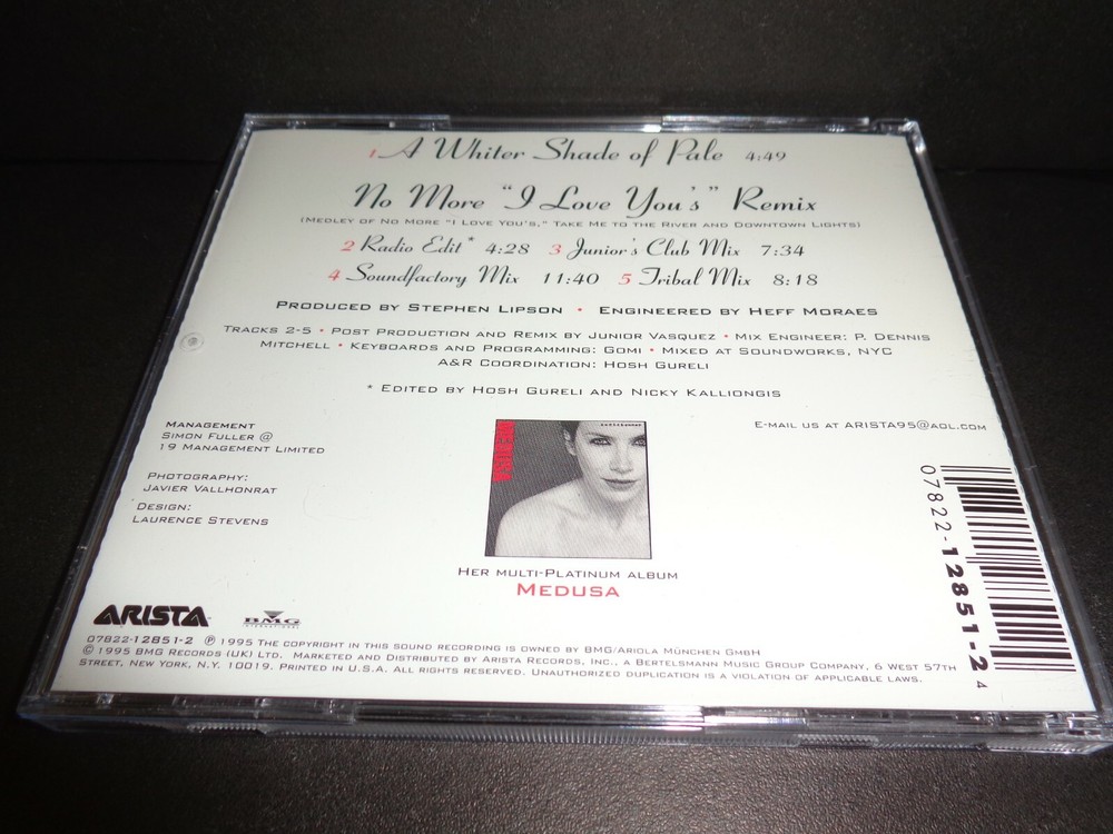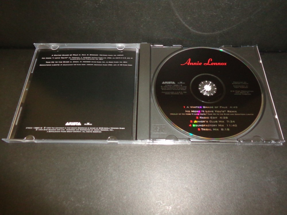 A WHITER SHADE OF PALE by ANNIE LENNOX Rare Collectible Maxi Single CD The CD comes in a jewel case Tracks include; 1. A Whiter Shade of Pale - Running time approximately 4 minutes 49 seconds NO MORE "I LOVE YOU'S" REMIX 2. Radio Edit - Running time approximately 4 minutes 28 seconds 3. Junior's Club Mix - Running time approximately 7 minutes 34 seconds 4. Soundfactory Mix - Running time approximately 11 minutes 40 seconds 5. Tribal Mix - Running time approximately 8 minutes 18 seconds Check out my other items ! Be sure to add me to your favorites list !