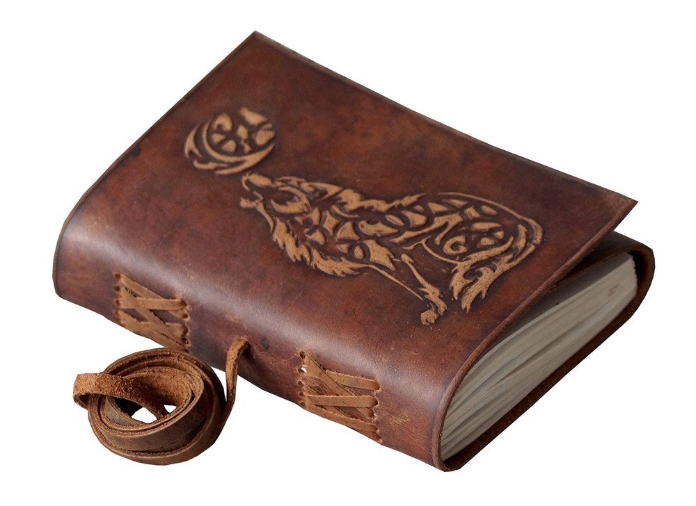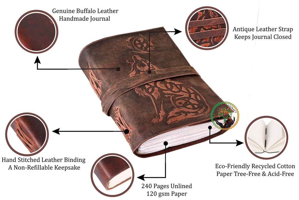This genuine is best quality hard embossing soft Scented pure leather Wolf Design antique leather journal celtic with Unlined 120 paper is the perfect journal to capture your important memories. Its handmade design is stylish - a perfect journal for men or women. The rustic finish can accompany you in all your travels or as a daily companion to capture your thoughts. The paper is high quality, natural 120GSM paper that prevents marker bleed, pen bleed. The hand stitched design will last for years to come. This leather journal for men and women is a perfect gift for any occasion. We value our customers and are committed to ensuring a wonderful experience. IDEAL SIZE - Handheld, medium size (7 x 5 x 1.2 inches). Easily carry this journal in your daily life and on your most exotic adventures. GENUINE LEATHER CRAFTSMANSHIP - Crafted with genuine crazy horse leather texture, this leather journal offers a soft touch exterior with natural, distressed look that’s truly exclusive. UNIQUE GIFTS - Stunning gifts for men on Father’s Day, Graduation or the perfect gift for women on Mother’s Day, Valentine’s Day, Birthday’s or Anniversary. A True Art Treasure, this blank unlined notebook will become a Family Heirloom! LEATHER STRAP CLOSURE - Notebook features leather bound closure to keep your secrets from prying eyes. A beautiful vintage look key holds the closure strap at front. MANY USES - Can be used as a notepad, journal, writing notebook, sketch book. 1.25 inch thickness, easy for handwriting, drawing or sketching and compact for carrying in your bag. Ideal for alternative Artist Sketchbooks, Photo Album, Traveling Notes, Business Executive, Logbook, Poetry Work, Journalists, Food Planner, Instagram Scrapbook and Bible Journaling.