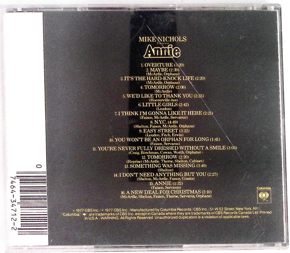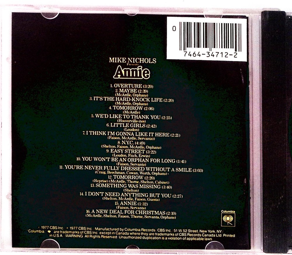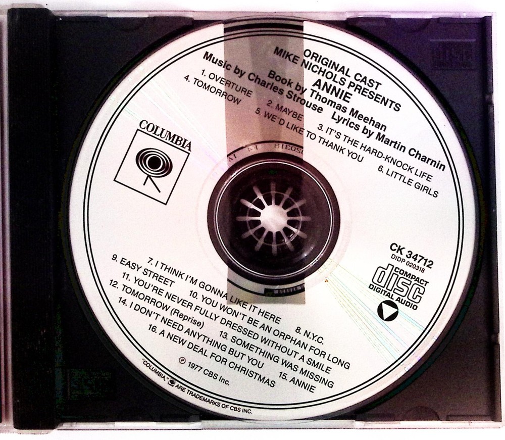 ANNIE A NEW MUSICAL ORIGINAL CAST RECORDING COLUMBIA RECORDS CD 4999. OVERALL VERY GOOD CONDITION WITH A HAIRLINE ON THE REVERSE. This item is from an estate that we are liquidating. We have never played the item, however we believe it to be in perfect playing condition. We have literally thousands more similar items including lps, 45s and 78s and cds. Please see the photos of the actual item for the best idea of condition. Be sure to check out all of the other great items that we have HERE