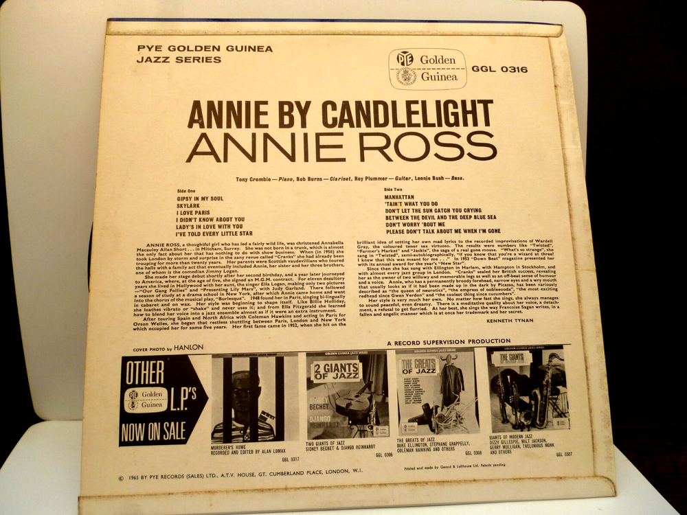 ANNIE BY CANDLELIGHT--ANNIE ROSS--TONY CROMBIE 4--LP--PYE GOLDEN GUINEA GGL 0316---RECORD IS VERY GOOD AS IS THE GOLDEN GUINEA INNER SLEEVE AND THE OUTER SLEEVE...