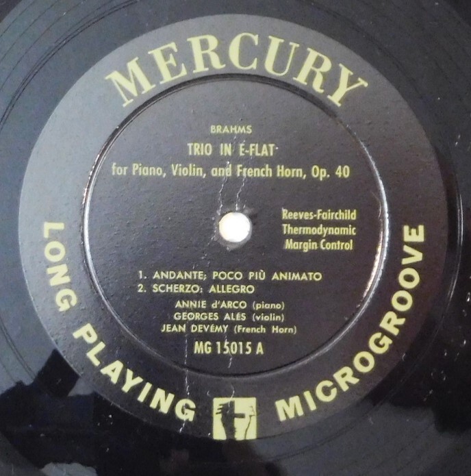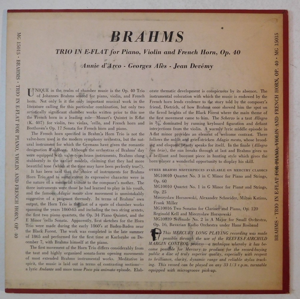 ANNIE D'ARCO GEORGES ALES JEAN DEVEMY Brahms Trio Op 40 MERCURY 10" LP 15015 VG+ ANNIE D'ARCO GEORGES ALES JEAN DEVEMY Brahms Trio Op 40 MERCURY 10" LP 15015 VG+ Record is VG+, plays with some ticks, and cover is EX, mono, 10" lp Shipping & Payment US shipping is $5.45 for as many items as you order. Please wait for my invoice for correct combined shipping charges, please look for a request invoice link in your cart if purchasing multiple items International shipping is $28.95 for one LP. 2 LP's depends on weight, average LP's will ship for $28.95, but earlier heavy mono LP's may be higher. I will do my best to pack well but keep costs down. 3 to 4 lps is $49.95. 5-6 lp's and up will be $69.95 and up. Box sets may cost more. Shipping to Australia is substantially more. These are approximate estimated prices , some early pressings may weigh more and may incure additional charges. I can only combine shipping of orders I send an invoice for. If international orders are paid separately, I may have to ship separately due to VAT taxes and such, as ebay will no longer let me combine some international orders separately paid. Shipping will either be through USPS or ebay's international shipping option. Payment is due within 2 days of purchase. I have a 3 business day handling time, I try and get orders out as quickly as I can but I am a one man operation at the moment. I appreciate your patience. Completely Guaranteed . Check my feedback, bid with confidence!