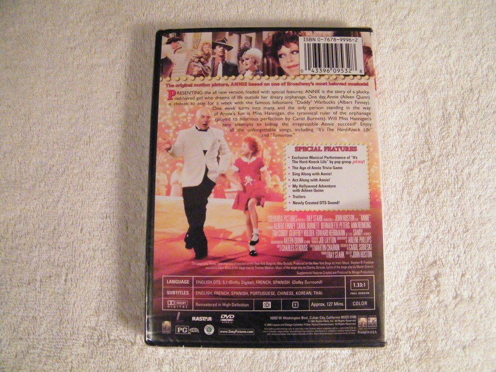 The DVD is titled ANNIE. The DVD is sealed in the original jewel case. Sealed. New. The jewel case has the shrink on sealed. Sealed. New. White title security tape on the top. Sealed. View the photos of the actual item. (C) 2003. "Special Features". "Special Anniversary Edition". Remastered in High Definition. (C) 1981 Rastar Films. Color. Approx. 127 minutes. Sealed. New. DVD. ANNIE. USPS shipping in the USA USPS tracking in the USA Cardboard mailer with bubble wrap for protection 23 years of providing outstanding service Thanks for your time