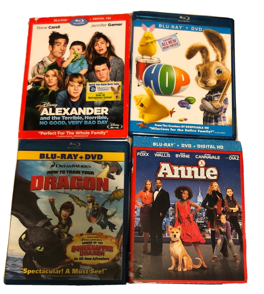 ANNIE Disney Alexander HOP Dreamworks How To Train Your Dragon Blu-ray DVD Lot. A 4 movie blu ray lot. Disney Alexander blu ray Hop bluray dvd combo How to train your Dragon bluray dvd combo Annie bluray dvd combo If applicable, presume any digital codes are either used or expired. Please refer to photos. Your item will ship well protected with tracking within one business day