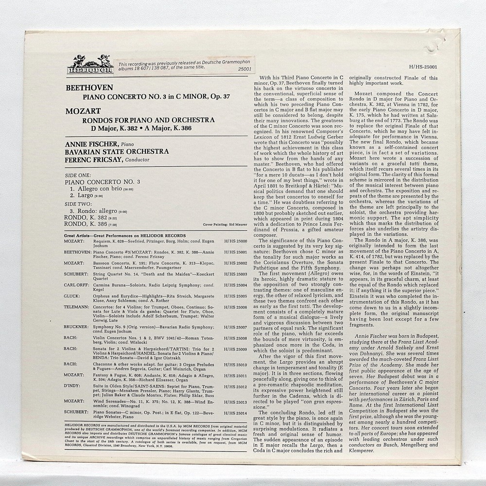 This record comes from a private, beautiful and considerable collection (~10.000 pieces) that has been kept untouched for more than 40 years. Records were bought new from the 50's to the 80's and have, in their vast majority, played once or even never been played. It includes many rarities such as original UK Decca SXL, Columbia SAX, His Master's Voice ASD, RCA SB series, original French ASDF, SAXF, Erato STE, Ducretet-Thomson, original German DG red stereo, original Holland Philips Hifi stereo, early stereo pressing and private issues... Beethoven : Piano concerto no.3 in C minor, op.37 Mozart : Rondos for piano & orchestra K.382 & K.386 Annie Fischer, piano Bavarian State Orchestra, dir. Ferenc Fricsay Heliodor H 25001 ⸺ US pressing. Cover : NM (pristine) Record : EX++ (few ultra soft tics, plays superb!) Weight including packaging : < 0.5Kg _______________________________________________________ More classical records in our ebay store intref 25 03 03 _______________________________________________________