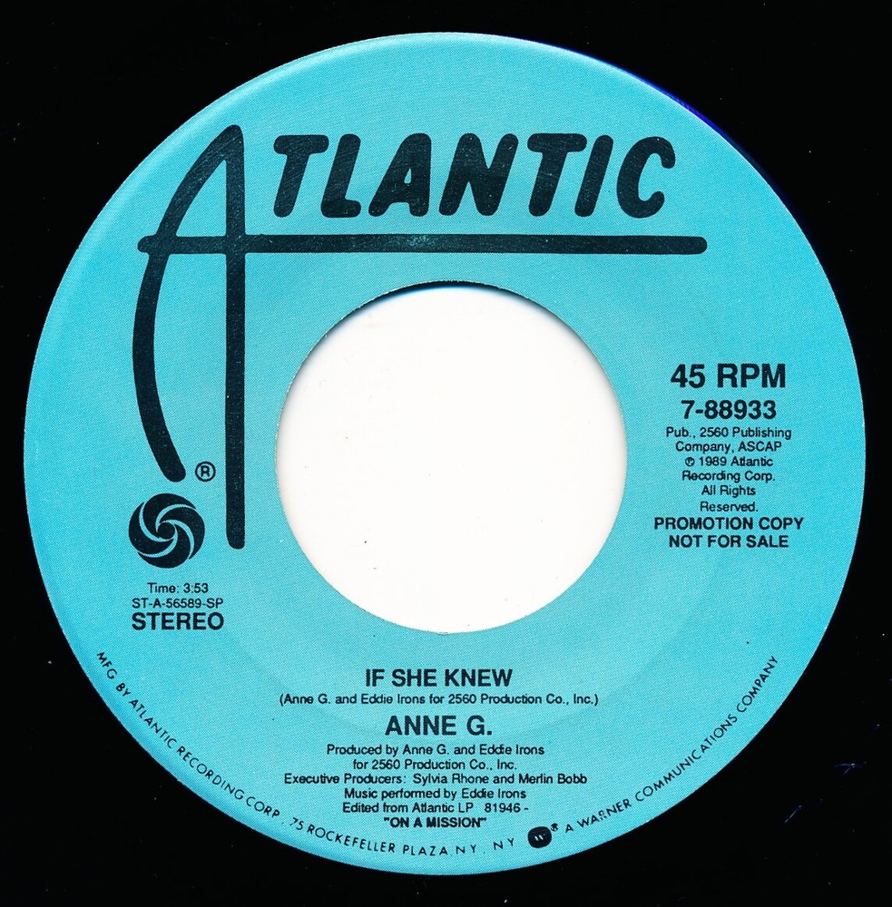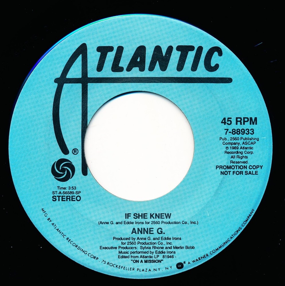 ANNIE G. - IF SHE KNEW - ATLANTIC 7-88933 - PROMO 45 Record VG+ ANNIE G. - IF SHE KNEW - ATLANTIC 7-88933 - PROMO 45 Record VG+ ANNIE G. IF SHE KNEW ATLANTIC 7-88933 - PROMO Vinyl Grade: VG+ Vinyl is in Very Good Plus (VG+) condition. A few light surface sleeve scuffs. Please examine gallery pictures to view label condition. This record was cleaned with the Spin-Clean Record Washer System. $4.45 Shipping for first 45 rpm record. . FREE SHIPPING FOR EACH ADDITIONAL 45 RPM RECORD SHIPPED WITHIN THE UNITED STATES IN THE SAME PACKAGE. NOTES: 1. The record has been spin-cleaned with the Spin-Clean washer system. 2. The sleeve has been replaced with a brand new white generic sleeve. 3. The record has been placed in a brand new polyproplyene outer sleeve. 4. The vinyl has been inspected under bright Ott-Lite (not play inspected) in order to determine condition. 5. The record will be placed, sandwiched between two 1/8" rigid cardboard pads. 6. The record will be shipped safely in a 7-1/2" x 7-1/2" shipping box. VINYL GRADING SCALE: NM Record appears unplayed; it will have no marks, sleeve scuffs, or scratches. VG++ Record will show one or two visible cosmetic imperfections (light scratches, sleeve scuffs or other superficial marks). VG+ Record will show a few visible imperfections. These may include sleeve scuffs, superficial marks, light scratches. VG Record will show several of the kinds of visible imperfections found on VG+ records. The record will not have scratches deep enough to be felt with a fingernail. VG- Record will show many visible imperfections including light scuffs/scratches. Also, one scratch deep enough to be felt with a fingernail will be graded VG-. G Record will show many visible imperfections including light scuffs/scratches. Also, multiple scratches deep enough to be felt with a fingernail will be graded G. Listing and template services provided by inkFrog