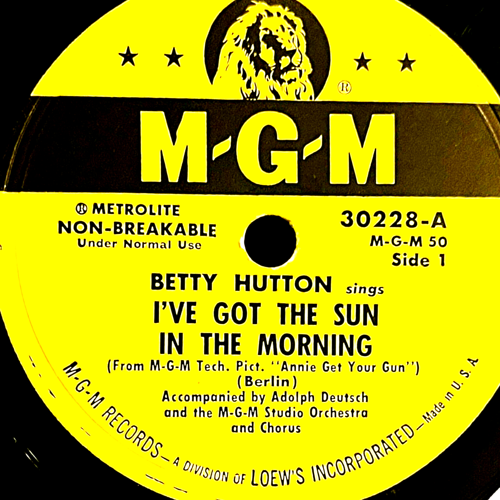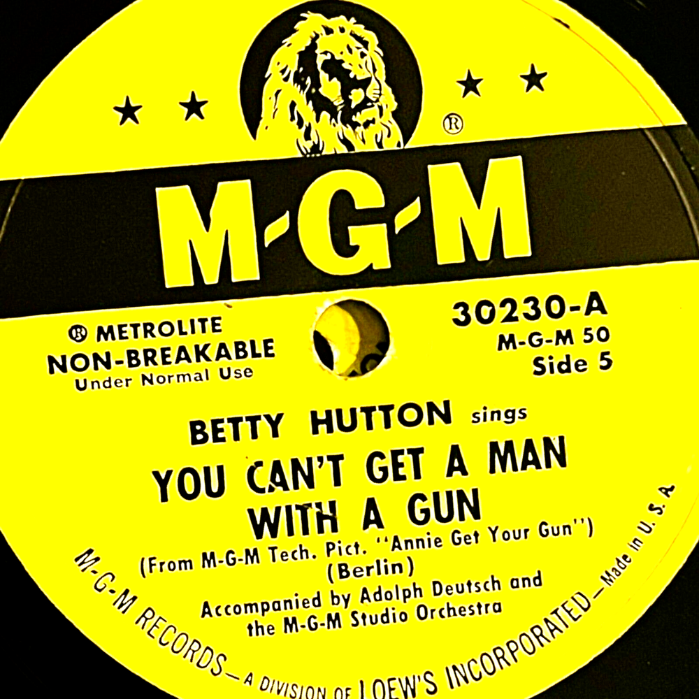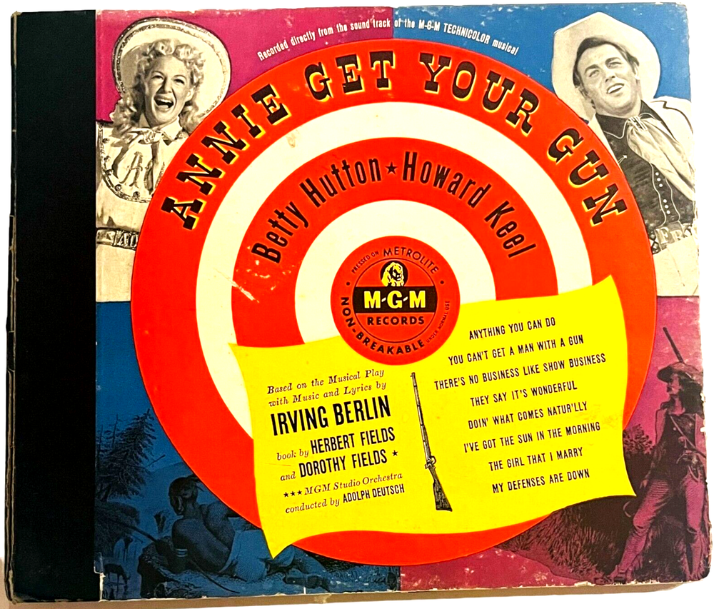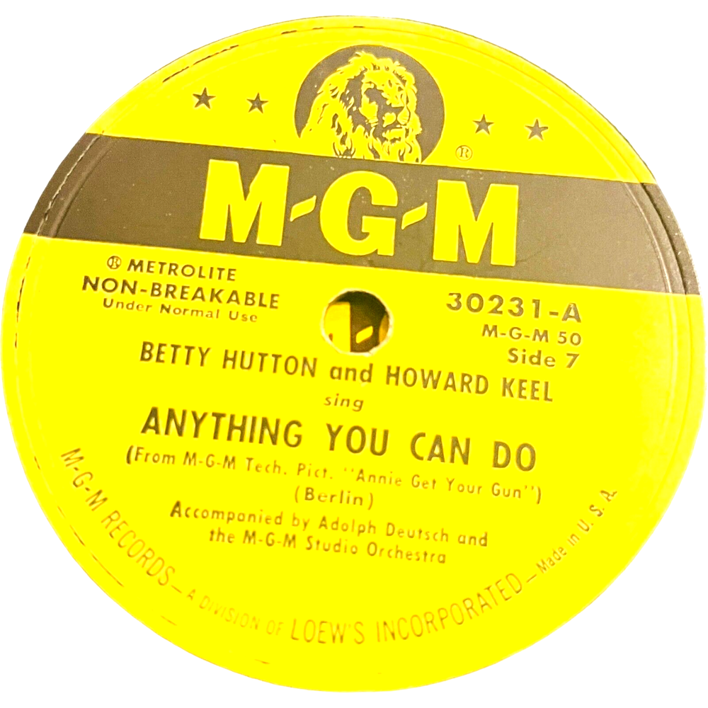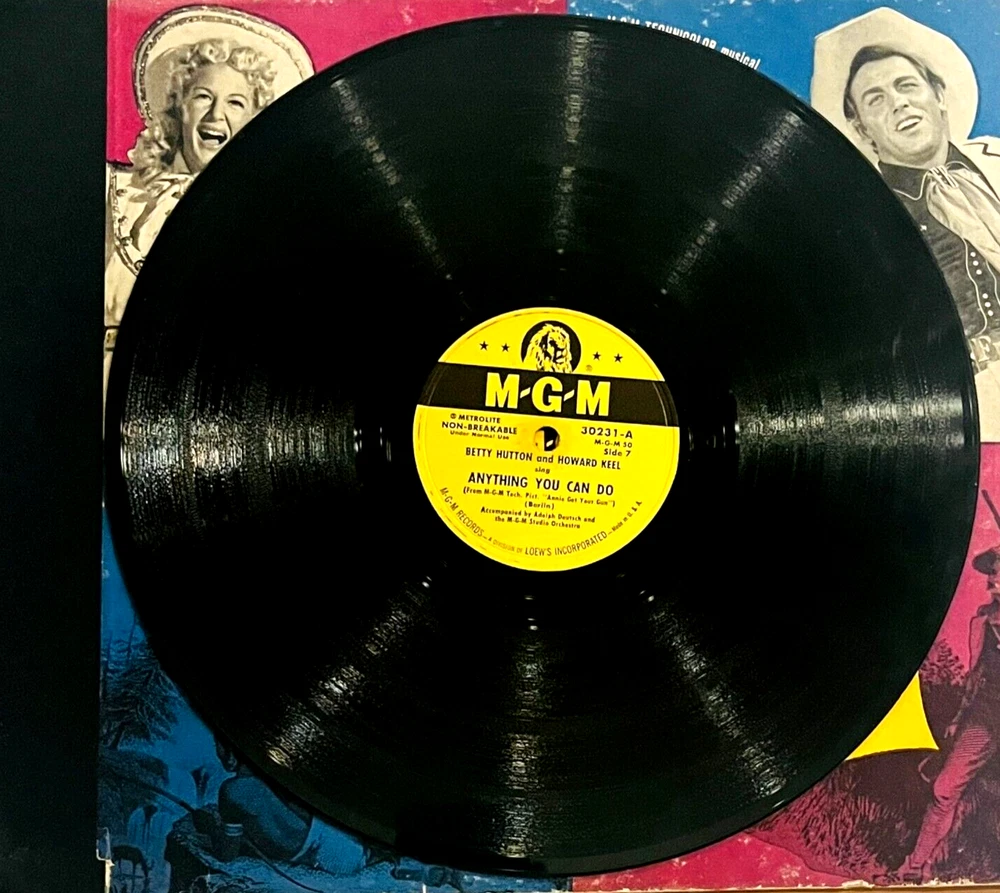 Own a piece of history with this 4-record box set of Annie Get Your Gun featuring the legendary Betty Hutton and Howard Keel. These 78 RPM records from MGM Records are a must-have for fans of the Irving Berlin musical play. The records come in a cardboard sleeve, catalog number M-G-M 50, and are made of shellac material. The records are in good plus (G+) condition and the sleeve is also in good plus (G+) condition. This 10" record set is perfect for collectors and music lovers alike. Don't miss out on this amazing opportunity to own a piece of musical history. FAST shipping from a trusted USA seller! All items ship within 1 business day of payment or sooner. You are purchasing the exact item shown. Please review all photos. All items are stored in a SMOKE FREE and temperature controlled environment. RECORD BUYERS: We do combined shipping at $3 additional each for shellacs and $2 additional for vinyl. 30-Day Money Back Guarantee * with Free Return Shipping! *All returns must be in the original condition as received and in the original packaging. Items that include a shipping charge will refund for the price of the item only. Thank you for visiting Mack's Marketplace! We are a small business reseller and are thrilled to have you here. We don't create, produce, or endorse any items unless stated otherwise. Check out our feedback to see what our customers are saying about us!
