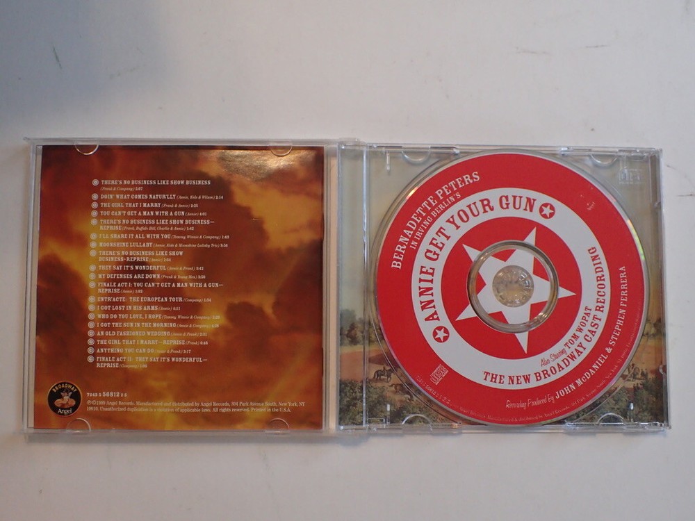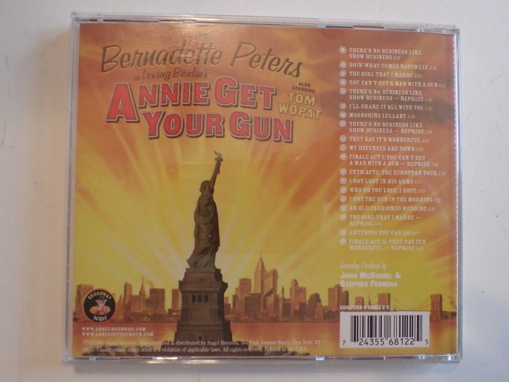 ITEM DESCRIPTION: Annie Get Your Gun - Broadway Cast Recording Music CD - Bernadette Peters. CONDITION: Previously owned, in excellent condition. SHIPPING: We only use USPS and FedEx. All items are safely packaged but they do still break on occasion. We buy insurance for fragile and/or valuable items to protect both of us from loss. We require a street address for FedEx deliveries. Bulky or very heavy items are listed for local pick-up only. Most other items are available for free local pick-up also. INTERNATIONAL SALES: This item is available to international buyers through the eBay Global Shipping program only. TERMS: By purchasing this item you agree to the outlined terms and conditions above.