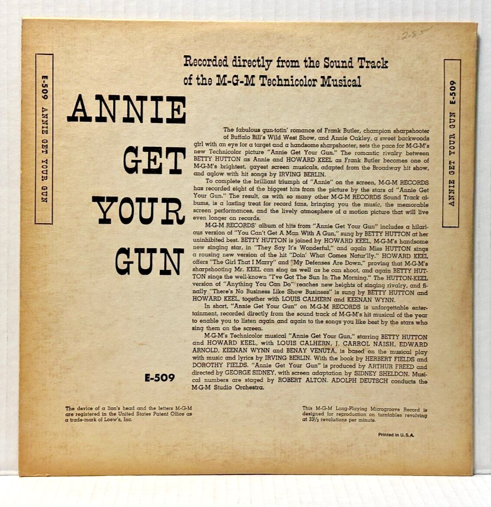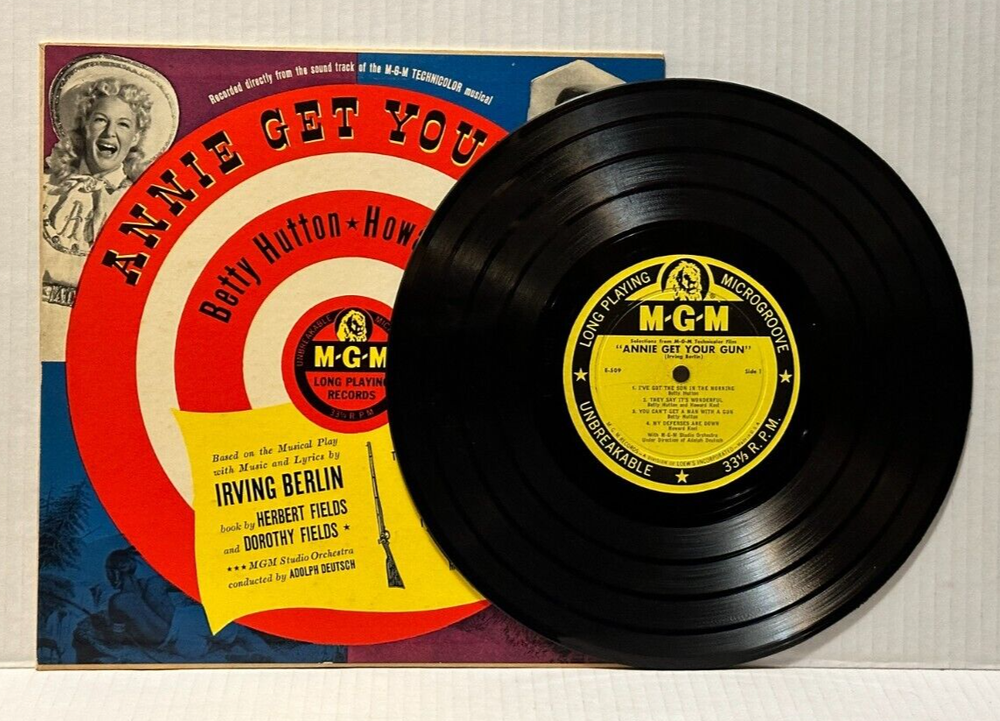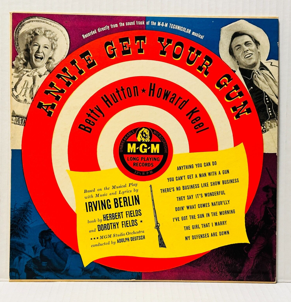 Annie Get Your Gun is a 1950 American musical Technicolor comedy film loosely based on the life of sharpshooter Annie Oakley. The Metro-Goldwyn-Mayer release, with music and lyrics by Irving Berlin and a screenplay by Sidney Sheldon based on the 1946 stage musical of the same name, was directed by George Sidney. Despite several production and casting problems (Judy Garland was fired from the lead role after a month of filming in which she clashed with the director and repeatedly showed up late or not at all), the film won the Academy Award for Best Scoring of a Musical Picture and received three other nominations. Star Betty Hutton was recognized with a Golden Globe nomination for Best Actress. The grueling tours Berlin did performing "This Is The Army" left him exhausted, but when his longtime close friend Jerome Kern, who was the composer for Annie Get Your Gun, died suddenly, producers Richard Rodgers and Oscar Hammerstein II persuaded Berlin to take over composing the score. Loosely based on the life of sharpshooter Annie Oakley, the music and lyrics were written by Berlin, with a book by Herbert Fields and his sister Dorothy Fields, and directed by Joshua Logan. At first Berlin refused to take on the job, claiming that he knew nothing about "hillbilly music", but the show ran for 1,147 performances and became his most successful score and biggest box office success. ________________________________________________________________________________________________________ About the eBay seller Country United States Founded June 28, 2004 eBay Store Relics Society Relics Society is a seller on eBay and has received feedback from more than two thousand consumers and has a positive feedback rate of 99.8%. This seller is situated in the United States and started online selling on eBay on Jun 28, 2004. All of their products are categorized as entertainment memorabilia, collectibles and Music Vinyl Records. They operate a store called Relics Society . _____________________________________________________________________________ Vinyl LP Record Album 12” 33 1/3 RPM Click here to Visit My Store Now domusroom and See All Specials for Great Albums and Savings Click here to Add my Store to your Favorites and receive my email newsletters about new items and special promotions! Click here to Visit My Brothers Store 45rpm Vinyl Records to See All Specials for Great 7” 45rpm Records Click here to Visit My Sisters items at Relics Society for Antiques, Vintage and Relics at Great Prices ___________________________________________________________________ If you are unhappy with your purchase, please do not leave negative feedback, contact me first and I will do everything I can to resolve any issues you may have. GRADING CONDITION (vinyl is first item in description and cover is second, description is always correct) Near Mint (NM or Mint M-) Vinyl : Shiny, no visible defects, writing, stickers, markings, spindle marks on label. No major factory defects or label pressed off center. No surface noise. Near Mint (NM or M-) Cover : Free of creases, ring wear and seam splits of any kind. Excellent (EX) Vinyl: Minor scuffs, slightly visible, not more than 15% of surface. Scratches that cannot be felt with fingernail. Plays close to perfect. Excellent (EX) Cover: Artwork should be close to perfect. Some impressions to the cover, minor outer ring wear, but no ink wear, slight creases to the corners not wrinkled. Corners or edges can show very slight wear. No seam splits, writing, or taped repairs. Very Good Plus (VG+) Vinyl: Shows slight signs of wear, including light scuffs, scratches, or warps that do not affect the listening experience. No misshapen hole. Very Good Plus (VG+) Cover: Minor seam wear or split, less than one inch. Some defacing, corner cut-out, saw cut, punch hole, light ring wear, ink or pen writing, edge or corner wear, or discoloration. SHIPPING - Discounts on quantity and shipping Albums are packaged in bubble bag, cardboard fillers on both sides and sealed in LP mailer for best protection. I always play grade albums that are for International shipment. If this is an International purchase, you will be sent an invoice from ebay "Global Shipping" for actual shipping cost. I have decided to use this method because as a buyer you will now have a tracking number and insurance claim options. Combined shipping is available ONLY if you PLACE ITEMS IN “SHOPPING CART” AND THEN PURCHASE. If you are buying International please email me before purchase so I can weigh the item for final shipment as all weights are estimated. THIS MAY SAVE YOU SHIPPING COSTS . Those cut-outs and hole punches in a record covers - why did they do it? In the recording industry, a cut-out refers to a deeply-discounted or remaindered copy of an LP, cassette tape, Compact Disc, or other item. When LPs were the primary medium for distribution or recording, manufacturers would physically cut the corner, punch a hole, or add a notch to the spine of the jacket of unsold records returned from retailers; these "cut-outs" might then be re-sold to record retailers or other sales outlets for sale at a discounted price.