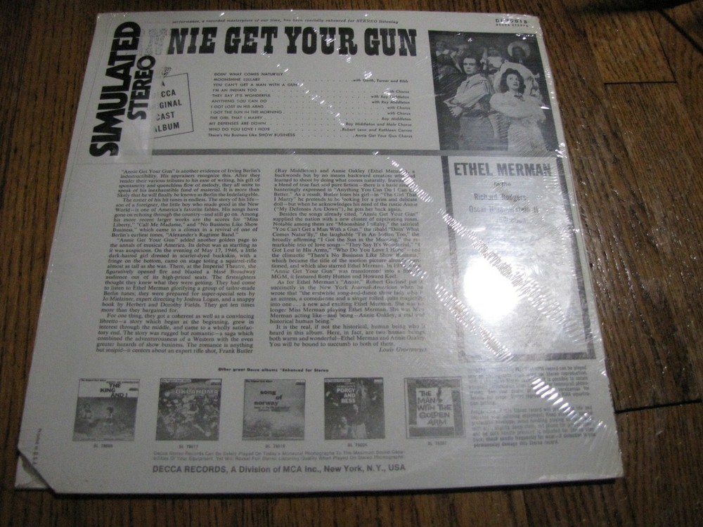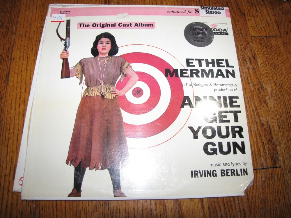 ANNIE GET YOUR GUN THE ORIGINAL CAST ALBUM - SEALED DECCA RECORDS LP 290Z GRADED VINYL "SEALED" GRADED JACKET "SEALED" SEE PICTURES SEE GRADING SCALE BELOW WILL COMBINE SHIPPING ON ALL ALBUM PURCHASES!!! DOMESTIC SHIPPING $4.00 FIRST 2 ALBUMS $1.00 FOR EACH ADDITIONAL ALBUM NO ALBUM LIMIT BUT MUST CASH OUT WITHIN 30 DAYS TO RECEIVE DISCOUNT. PLEASE WAIT FOR INVOICE PRIOR TO PAYING FOR MULTI ITEM PURCHASE!! ** INTERNATIONAL BUYERS ** FOR ALL INTERNATIONAL DESTINATIONS PLEASE INQUIRE FOR COMBINED SHIPPING COST PRIOR TO PURCHASE. I am not responsible for mishandling of parcels by the postal service Grading SCALE (NM) Perfect. No visible defects to vinyl or jacket (EXC) Very close to being NM. Hardly any signs of wear to vinyl or jacket (VG+) Some slight signs of wear to cover. Vinyl has light scuffs and very light scratches that have little or no effect on listening quality. Some edge wear to jacket. (VG) Clear signs of use. Limited scuffs and scratches causing surface noise. Jacket worn. (G) Acceptable condition. Very clear signs of use and wear. Vinyl well used scuffed and scratched but not useless. Jacket very worn. LP WILL BE removed from cover (except for SEALED LPs) for shipping to help prevent seam splitting. IF YOU ARE LOOKING FOR SOMETHING SPECIFIC THAT IS CURRENTLY NOT LISTED LET ME KNOW AS I HAVE AN EXTENSIVE COLLECTION OF VINYL Should a buyer feel the product received does not meet the stated item description, a full refund including return postage will be provided. Buyer has 30 days to return item from date received. Buyer must first contact seller to make arrangement for return shipment. Refunds will be made only after return shipment to, and re-inspection by the seller. The USPS postal weight limit for international FIRST CLASS mail is 3 pounds 15 ounces TYPICALLY three RECORDS packed. All international shipments 4 pounds and OVER must upgrade to USPS Priority Mail.