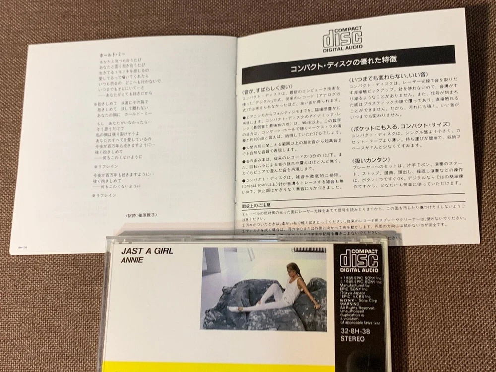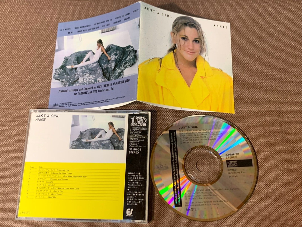 SHIPPING IS FREE! TO ALL OVER THE WORLD via registered AIR with tracking No extra shipping needed when you buy additional FREE SHIPPING items ANNIE Just A Girl (1985) Joey Carbone, Richie Zito JAPAN CD, 1985 issue, no barcode, Smooth top jewel, CSR COMPACT DISC w/Picture Sleeve Booklet (No OBI) Epic/Sony Inc. 32.8H-38 This is a Japanese CD released from Epic/Sony Inc. in 1985. Comes with Picture Sleeve Booklet. No OBI. Cat. number: 32.8H-38 ( Epic/Sony Inc.) Matrix: 32.8H-38 11 +++++ This is not a bootleg, cheap home burned CD, we sell 100% genuine official items only. Import duties, taxes and charges are not included in the item price or shipping charges. These charges are the buyer’s responsibility. * EARLY TYPE SMOOTH TOP & BOTTOM JEWEL CASE has smooth frosted glass-like surface on top & bottom of jewel case instead of surface with ridges of regular jewel case. They were used only for few years from the first release year of Compact Disc, 1982 . See the pics & compare the difference. CHECK MORE OF OUR RELATED L ISTINGS FROM THE URL LINK BELOW or 'CATEGORIES' BUTTON <<LEFT! 1980's JAPAN EARLY PRESS CD http://stores.ebay.com/GROOVIN-JAPAN-STORE/JAPANESE-EARLY-PRESS-CD-/_i.html?_fsub=1662392011&_sid=812439881&_trksid=p4634.c0.m322 ACCESSORIES / PLASTIC BAGS EXTRA % OFF WHEN YOU BUY 2 OR MORE CONDITIONS PICTURE SLEEVE : Ex CD : Ex-- (Slight scratches, No skipping) OBI: none GRADING Mint:Like new,no damages,just opened and never played Near Mint:Played several times, very light scuffs are visible Excellent:Few Slight Scratched,Scuffs,Slight Bit Folded(Stain) with the insert(OBI) Very Good:Polish Marks,Many Scratches,Large Split with the insert(OBI) Excellent does not mean "Like New", might have slight wear/or creasing. We don't grade plastic case. FOR THE DETAILS,PLEASE EMAIL US or SEE THE PICTURES CAREFULLY BEFORE YOU BID. Track listings 1 D.J. In My Life 2 I Wanna Be Your Lover 3 One More Night With You 4 Winners And Losers 5 Tonight 6 Mr. D.J. 7 I Don't Wanna Lose Your Love 8 Just A Girl 9 Good Lovin' 10 Hold Me Musician – Andrea Robinson, Art Wood, Arthur Barrow, David Woodford, George Doering Producer, Arranged By, Musician, Vocals – Joey Carbone, Richie Zito Vocals – Annie Recorded and mixed at Doering Studio, Hollywood, California. SHIPPING SHIPPING IS FREE! TO ALL OVER THE WORLD via registered AIR with tracking ・Import duties, taxes and charges are not included in the item price or shipping charges. These charges are the buyer’s responsibility. ・Please check with your country’s customs office to determine what these additional costs will be prior to bidding/buying. *IMPORTANT! TRACK&TRACE* USE JAPAN POST'S TRACKING TO TRACK & TRACE YOUR ITEM, AS EBAY DOESN'T ALWAYS PROVIDE CORRECT DELIVERY STATUS FOR ITEMS SHIPPED FROM JAPAN ON YOUR MY EBAY. IN CASE YOU DON'T RECEIVE ITEMS AFTER 2 WEEKS FROM THE DISPATCH NOTE FROM US, PLEASE CONTACT US FIRST AND DO NOT OPEN 'ITEMS NOT RECEIVED' CASE TOO SOON. COMBINED SHIPPING No extra shipping needed when you buy additional FREE SHIPPING items YES! We gladly combine the shipping for small extra cost, ask seller for details. CHECK OUT OUR OTHER ITEMS FOR COMBINED SHIPPING! PAYMENT Payment should be completed within 72 hours. OTHERS ・Import duties, taxes and charges are not included in the item price or shipping charges. These charges are the buyer’s responsibility. ・Please check with your country’s customs office to determine what these additional costs. These charges are normally collected by the delivering freight (shipping) company or when you pick the item up - do not confuse them for additional shipping charges. ・We ship item ONLY to your ebay registered shipping address. CHECK MORE OF OUR RELATED L ISTINGS FROM THE URL LINK BELOW or 'CATEGORIES' BUTTON <<LEFT! 1980's JAPAN EARLY PRESS CD http://stores.ebay.com/GROOVIN-JAPAN-STORE/JAPANESE-EARLY-PRESS-CD-/_i.html?_fsub=1662392011&_sid=812439881&_trksid=p4634.c0.m322 ACCESSORIES / PLASTIC BAGS EXTRA % OFF WHEN YOU BUY 2 OR MORE *IMPORTANT! TRACK&TRACE* USE JAPAN POST'S TRACKING TO TRACK & TRACE YOUR ITEM, AS EBAY DOESN'T ALWAYS PROVIDE CORRECT DELIVERY STATUS FOR ITEMS SHIPPED FROM JAPAN ON YOUR MY EBAY. IN CASE YOU DON'T RECEIVE ITEMS AFTER 2 WEEKS FROM THE DISPATCH NOTE FROM US, PLEASE CONTACT US FIRST AND DO NOT OPEN 'ITEMS NOT RECEIVED' CASE TOO SOON.