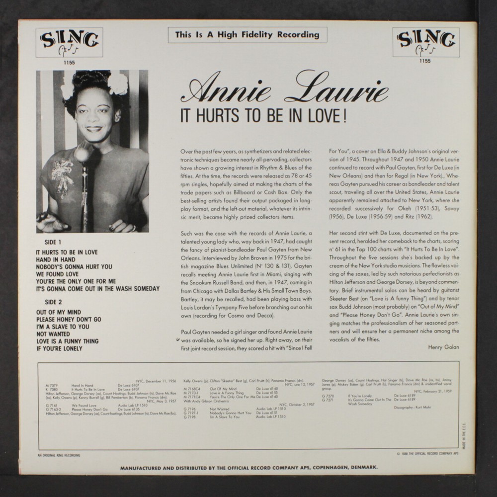 Item Details ANNIE LAURIE it hurts to be in love Label: SING 1155 Format: 12" LP (33 RPM) Disc Condition: M- Cover Condition: M- Genre: Blues & R&B Country: Denmark Price: $18 Shipping Info All orders are processed and shipped within 2 business days of receipt. We package and ship our vinyl records with the greatest care, using extra-thick packaging to ensure that your rare and collectible vinyl records arrive in pristine condition. Domestic Shipments USPS Priority Mail LP Only Shipments $15 for 1st LP + $2 each additional LP 45s, CDs and Cassettes $10.00 for 1st + $1 each additional Mixed Shipments $15 for 1st LP + $2 each additional LP / $1 each additional 45/CD/Cassette Oversized CDs, Cassettes, & 45s $14 base rate for 1st / $1 base rate each additional oversized + $1 each 45/CD/Cassette USPS Media Mail LP Only Shipments $7 for 1st LP + $1 each additional LP Mixed Shipments $7 for 1st LP + $1 each additional Oversized CDs, Cassettes, & 45s $6 base rate for 1st + $1 each 45/CD/Cassette Note: All domestic shipments are insured. International Shipments Air Mail LP Only Shipments $20 for 1st LP + $5 each additional LP 45 Only Shipments $18 for 1st 45 + $1 each additional 45 Mixed Shipments $20 for 1st LP + $5 each additional LP / $1 each additional Oversized CDs, Cassettes, & 45s $19 base rate for 1st / $1 each additional oversized + $1 each 45/CD/Cassette Note: Double LPs, box sets, etc. will incur additional shipping costs as indicated above. Record Grading Grade Explanation SS Still Sealed In factory-fresh condition. M Mint We don't use this grade. M- Mint Minus A near perfect, probably unplayed record. VG+ Very Good Plus Close to like new with only superficial signs of use that don't affect play. Only well cared for records will grade out to VG+. Will satisfy all but the most demanding collector. VG Very Good A used, reasonable copy. There will be obvious signs of wear and the possibility of light surface noise between tracks or during quiet passages, but still quite nice. VG- Very Good Minus Significant wear and marks and usually quite noticeable surface noise. G+ Good Plus In the record world, 'Good' is not good! From here on down (Fair, Poor), we're talking about beat-up records. * Unless noted, every record is an original issue for the label and catalog number. About Us Records By Mail offers one of the most comprehensive selections of vinyl LPs and 45s available anywhere. Housed in an 8,000 square foot warehouse that currently holds over 2 million records, Craig and his talented, dedicated staff serve music lovers in more than 60 countries. Records by Mail prides itself on maintaining one of the largest selections of rare vinyl records available anywhere—online or off. We are always looking to improve the quality of our service, and we update our database every day, so expect new titles and improvements with alarming frequency. Browse Categories Rock & Pop Soul Blues & R&B Oldies Jazz Funk Vocal Groups Rockabilly Country Vocalists Brazilian Punk/New Wave Easy Listening Soundtracks Reggae Black Gospel Rap/Hip-Hop Latin Our Guarantee We guarantee every item we sell to be as listed. We endeavor to provide superior service, but if we make an error, we'll make every effort to make it right either by refunding all costs involved, or adjusting the selling price to everyone's satisfaction.