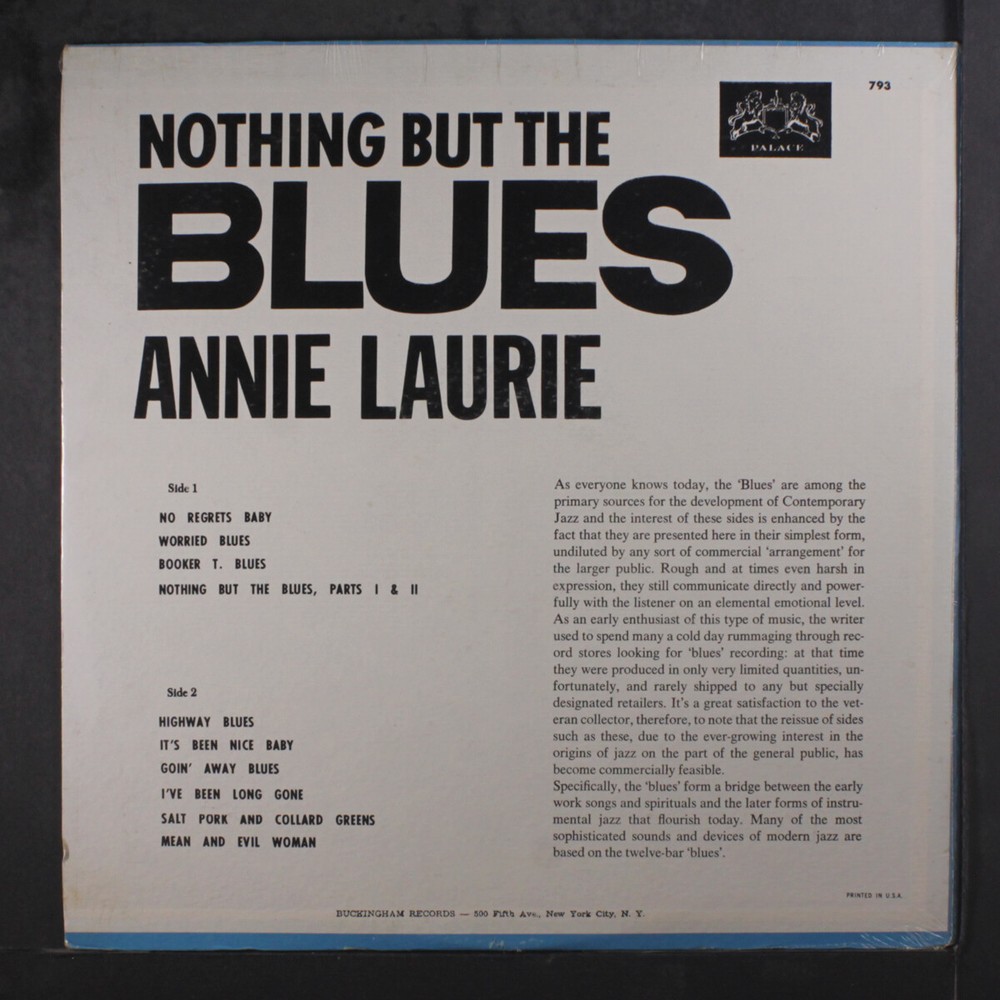 Item Details ANNIE LAURIE nothin' but the blues Label: PALACE 793 Format: 12" LP (33 RPM) Disc Condition: Still Sealed Cover Condition: Still Sealed Genre: Blues & R&B Edition: Mono Price: $20 Shipping Info All orders are processed and shipped within 2 business days of receipt. We package and ship our vinyl records with the greatest care, using extra-thick packaging to ensure that your rare and collectible vinyl records arrive in pristine condition. Domestic Shipments USPS Priority Mail LP Only Shipments $15 for 1st LP + $2 each additional LP 45s, CDs and Cassettes $10.00 for 1st + $1 each additional Mixed Shipments $15 for 1st LP + $2 each additional LP / $1 each additional 45/CD/Cassette Oversized CDs, Cassettes, & 45s $14 base rate for 1st / $1 base rate each additional oversized + $1 each 45/CD/Cassette USPS Media Mail LP Only Shipments $7 for 1st LP + $1 each additional LP Mixed Shipments $7 for 1st LP + $1 each additional Oversized CDs, Cassettes, & 45s $6 base rate for 1st + $1 each 45/CD/Cassette Note: All domestic shipments are insured. International Shipments Air Mail LP Only Shipments $20 for 1st LP + $5 each additional LP 45 Only Shipments $18 for 1st 45 + $1 each additional 45 Mixed Shipments $20 for 1st LP + $5 each additional LP / $1 each additional Oversized CDs, Cassettes, & 45s $19 base rate for 1st / $1 each additional oversized + $1 each 45/CD/Cassette Note: Double LPs, box sets, etc. will incur additional shipping costs as indicated above. Record Grading Grade Explanation SS Still Sealed In factory-fresh condition. M Mint We don't use this grade. M- Mint Minus A near perfect, probably unplayed record. VG+ Very Good Plus Close to like new with only superficial signs of use that don't affect play. Only well cared for records will grade out to VG+. Will satisfy all but the most demanding collector. VG Very Good A used, reasonable copy. There will be obvious signs of wear and the possibility of light surface noise between tracks or during quiet passages, but still quite nice. VG- Very Good Minus Significant wear and marks and usually quite noticeable surface noise. G+ Good Plus In the record world, 'Good' is not good! From here on down (Fair, Poor), we're talking about beat-up records. * Unless noted, every record is an original issue for the label and catalog number. About Us Records By Mail offers one of the most comprehensive selections of vinyl LPs and 45s available anywhere. Housed in an 8,000 square foot warehouse that currently holds over 2 million records, Craig and his talented, dedicated staff serve music lovers in more than 60 countries. Records by Mail prides itself on maintaining one of the largest selections of rare vinyl records available anywhere—online or off. We are always looking to improve the quality of our service, and we update our database every day, so expect new titles and improvements with alarming frequency. Browse Categories Rock & Pop Soul Blues & R&B Oldies Jazz Funk Vocal Groups Rockabilly Country Vocalists Brazilian Punk/New Wave Easy Listening Soundtracks Reggae Black Gospel Rap/Hip-Hop Latin Our Guarantee We guarantee every item we sell to be as listed. We endeavor to provide superior service, but if we make an error, we'll make every effort to make it right either by refunding all costs involved, or adjusting the selling price to everyone's satisfaction.