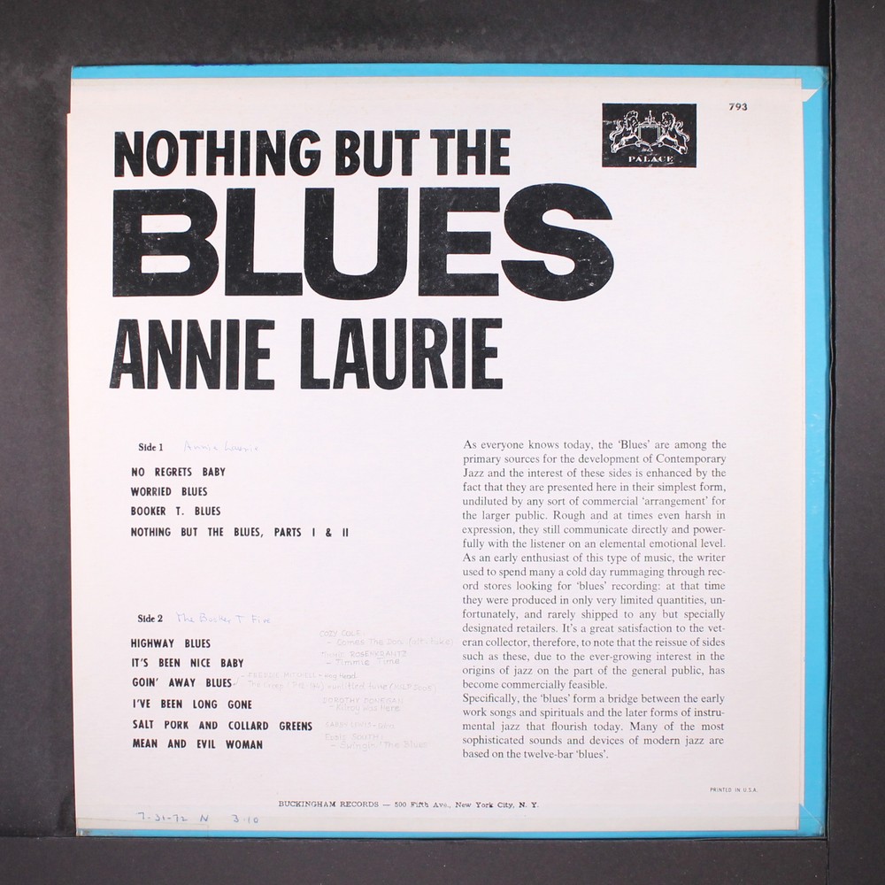 Item Details ANNIE LAURIE nothing but the blues Label: PALACE 793 Format: 12" LP (33 RPM) Disc Condition: VG+ Cover Condition: VG+ , writing on back cover, neat clear taped seams Genre: Blues & R&B Price: $18 Shipping Info All orders are processed and shipped within 2 business days of receipt. We package and ship our vinyl records with the greatest care, using extra-thick packaging to ensure that your rare and collectible vinyl records arrive in pristine condition. Domestic Shipments USPS Priority Mail LP Only Shipments $15 for 1st LP + $2 each additional LP 45s, CDs and Cassettes $10.00 for 1st + $1 each additional Mixed Shipments $15 for 1st LP + $2 each additional LP / $1 each additional 45/CD/Cassette Oversized CDs, Cassettes, & 45s $14 base rate for 1st / $1 base rate each additional oversized + $1 each 45/CD/Cassette USPS Media Mail LP Only Shipments $7 for 1st LP + $1 each additional LP Mixed Shipments $7 for 1st LP + $1 each additional Oversized CDs, Cassettes, & 45s $6 base rate for 1st + $1 each 45/CD/Cassette Note: All domestic shipments are insured. International Shipments Air Mail LP Only Shipments $20 for 1st LP + $5 each additional LP 45 Only Shipments $18 for 1st 45 + $1 each additional 45 Mixed Shipments $20 for 1st LP + $5 each additional LP / $1 each additional Oversized CDs, Cassettes, & 45s $19 base rate for 1st / $1 each additional oversized + $1 each 45/CD/Cassette Note: Double LPs, box sets, etc. will incur additional shipping costs as indicated above. Record Grading Grade Explanation SS Still Sealed In factory-fresh condition. M Mint We don't use this grade. M- Mint Minus A near perfect, probably unplayed record. VG+ Very Good Plus Close to like new with only superficial signs of use that don't affect play. Only well cared for records will grade out to VG+. Will satisfy all but the most demanding collector. VG Very Good A used, reasonable copy. There will be obvious signs of wear and the possibility of light surface noise between tracks or during quiet passages, but still quite nice. VG- Very Good Minus Significant wear and marks and usually quite noticeable surface noise. G+ Good Plus In the record world, 'Good' is not good! From here on down (Fair, Poor), we're talking about beat-up records. * Unless noted, every record is an original issue for the label and catalog number. About Us Records By Mail offers one of the most comprehensive selections of vinyl LPs and 45s available anywhere. Housed in an 8,000 square foot warehouse that currently holds over 2 million records, Craig and his talented, dedicated staff serve music lovers in more than 60 countries. Records by Mail prides itself on maintaining one of the largest selections of rare vinyl records available anywhere—online or off. We are always looking to improve the quality of our service, and we update our database every day, so expect new titles and improvements with alarming frequency. Browse Categories Rock & Pop Soul Blues & R&B Oldies Jazz Funk Vocal Groups Rockabilly Country Vocalists Brazilian Punk/New Wave Easy Listening Soundtracks Reggae Black Gospel Rap/Hip-Hop Latin Our Guarantee We guarantee every item we sell to be as listed. We endeavor to provide superior service, but if we make an error, we'll make every effort to make it right either by refunding all costs involved, or adjusting the selling price to everyone's satisfaction.