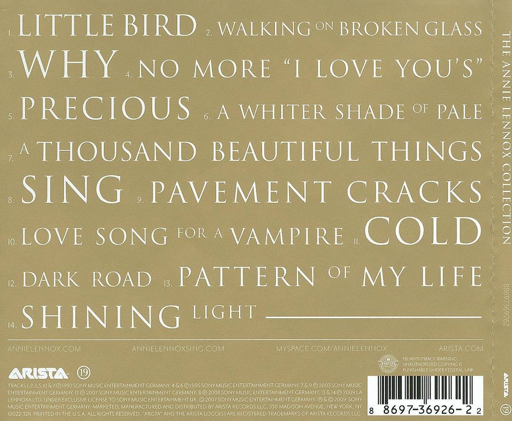 Additional Information from InnerSleeve Product Description 1. Little Bird 2. Walking On Broken Glass 3. Why 4. No More "I Love You's" 5. Precious 6. Whiter Shade Of Pale, A 7. Thousand Beautiful Things, A 8. Sing - (featuring Fergie/Dido/Shingai Shoniwa/P!nk/Faith Hill/Isobel Campbell/Joss Stone/k.d. lang/Madonna/Martha Wainwright/Melissa Etheridge/Anastacia/Ang‚lique Kidjo/Sarah McLachlan/Shakira/Sugababes/Beth Gibbons/Beth Orton/Beverley Knight/Gladys 9. Pavement Cracks 10. Love Song For A Vampire 11. Cold 12. Dark Road 13. Pattern Of My Life 14. Shining Light About InnerSleeve We offer unbeatable prices, quick shipping times and a wide selection of vinyl. Purchases come with a 30-day Satisfaction Guarantee (minus Shipping & Handling fees) on all unopened products. All items are from licensed Distributors. We do not deal with any Bootleg or Used items!