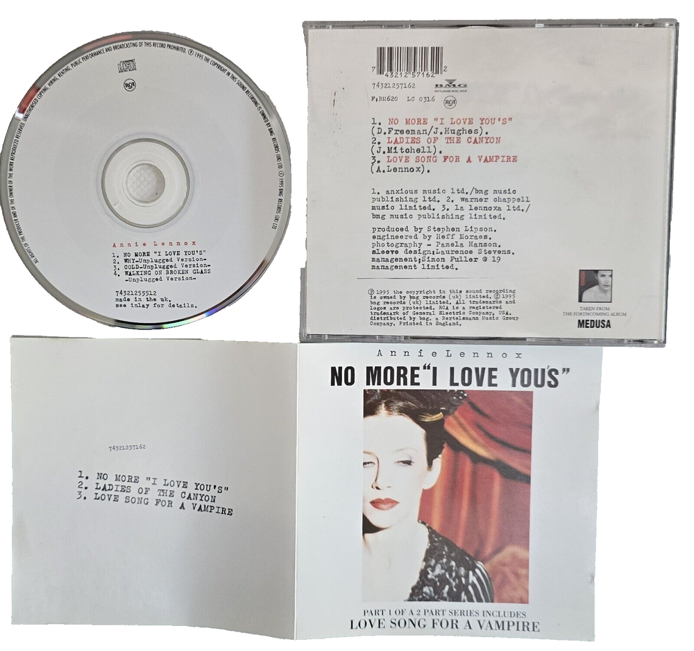 This is an unplayed original CD single by Annie Lennox which was released in the United Kingdom in 1995. The CD and its insert are both in absolutely mint condition and the CD has never been played. The tracks on the CD are: 1 - No More I Love You's 2 - Why (Unplugged Version) 3 - Cold (Unplugged Version) 4 - Walking On Broken Glass (Unplugged Version) Postage cost includes bespoke packaging materials to protect your purchase. Check out all my other Annie / Eurythmics eBay listings!