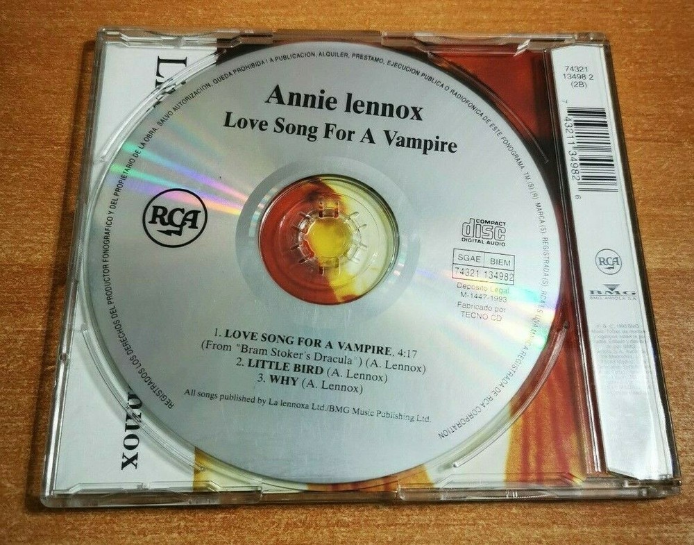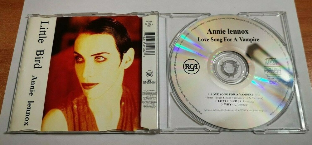 ANNIE LENNOX Ultra Rare SPANISH ("MADE IN SPAIN") CD SINGLE with 3 tracks: 1.- LOVE SONG FOR A VAMPIRE. 2.- LITTLE BIRD. 3.- WHY. Wonderful and UNIQUE PICTURE SLEEVE in slim plastic box, totally diferent to any other cover from all around the world!! The CD have a few slight marks but play perfectly!! Cat. number: 74321 13498 2. This RARE CD SINGLE is from 1.993 and NOW is VERY, VERY HARD TO FIND because the CD is OUT OF PRINT for many years ago!! Special item for all the ANNIE LENNOX fans and collectors. I SHIP ALL MY ITEMS BY REGISTERED AIRMAIL (with INSURANCE). IN THIS WAY EBAY AND PAYPAL CAN KNOW WHAT I SENT YOU THE PACKET AND EBAY AND PAYPAL CAN KNOW WHAT YOU RECEIVED THE PACKET BECAUSE THESE PACKETS ARE TRACKED AND YOU NEED PUT YOUR SIGNATURE FOR PICK-UP THE PACKET!! Payment must be received within 4 days of the auction ending date.