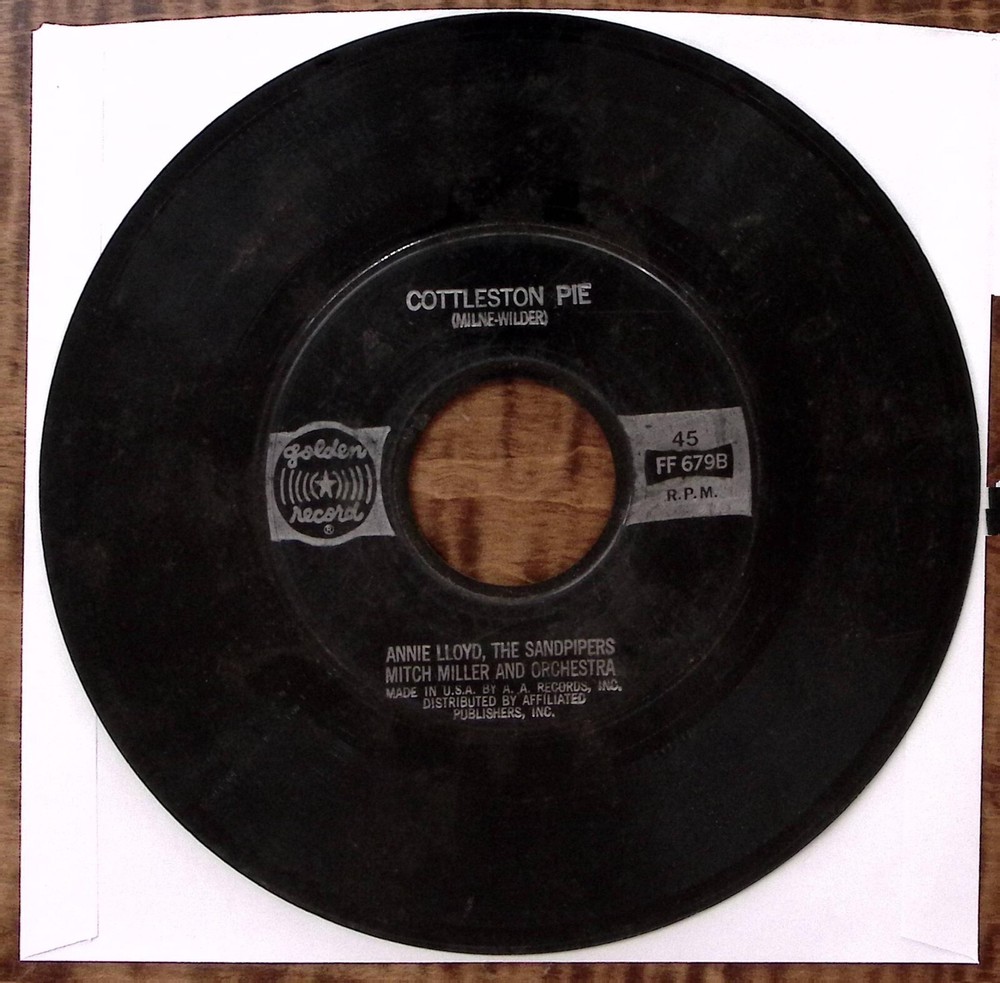 ANNIE LLOYD/MITCH MILLER/SANDPIPERS COTTLESTON PIE GOLDEN RECORD VINYL 45 52-161 OVERALL VERY GOOD CONDITION! THIS 45 WAS PART OF AN ESTATE THAT WE RECENTLY AQUIRED AND ARE LIQUIDATING. WE HAVE NEVER PLAYED ANY OF OUR RECORDS, HOWEVER WE ARE REPRESENTING THAT THEY WILL PLAY NICELY. WE OFFER FREE RETURNS FOR ANY REASON, SO IF THERE ARE ANY ISSUES PLEASE JUST LET US KNOW. WE ARE NOT RECORD DEALERS...SIMPLY LIQUIDATORS SO OUR DESCRIPTION IS SIMPLY A GENERAL OBSERVATION OF THE RECORD AND THE COVER. IT IS NOT MEANT TO BE ANY OFFICIAL GRADE. WE ARE ALWAYS HAPPY TO COMBINE SHIPPING IF YOU PURCHASE MULTIPLE ITEMS...JUST SHOOT US A MESSAGE AND WE WILL BE HAPPY TO COMBINE ALL OF THE ITEMS INTO 1 INVOICE. Be sure to check out all of the other great items that we have HERE