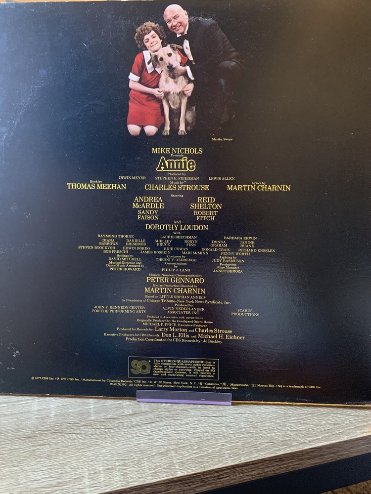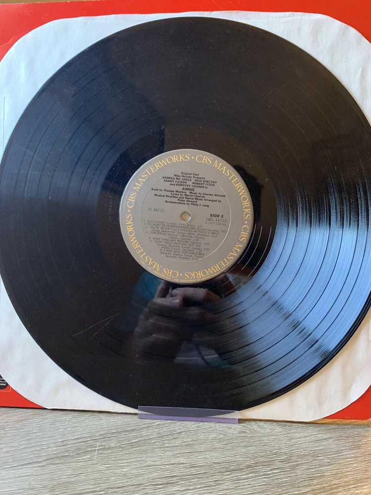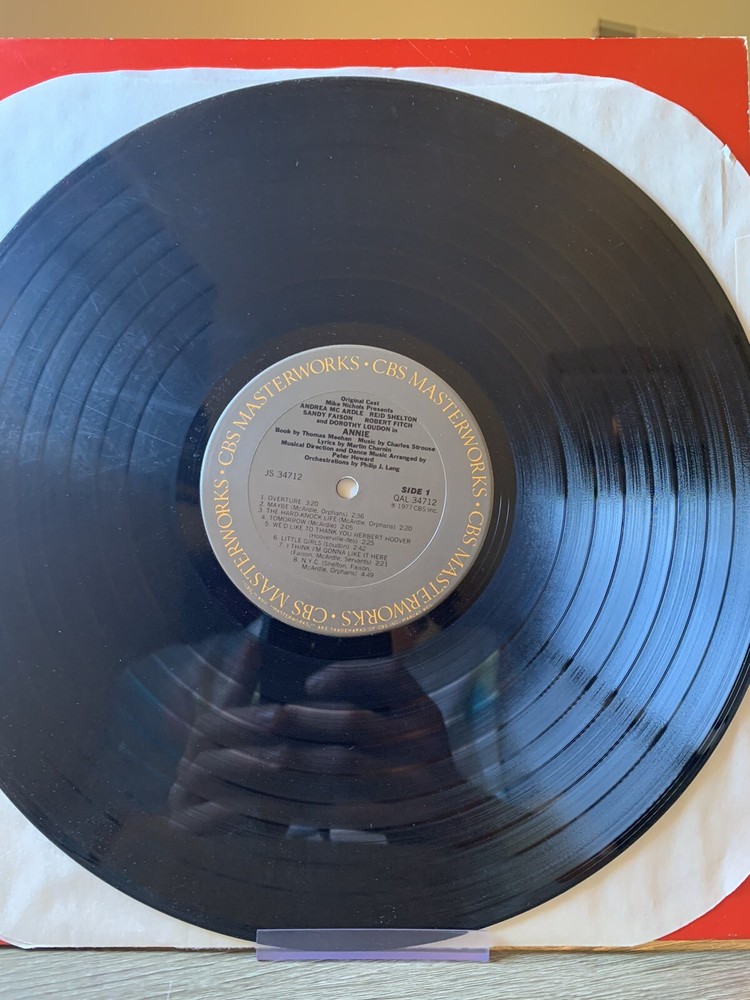 ANNIE Original Broadway Cast Soundtrack LP Vinyl CBS Records 1977 JS34712 QBL. Outer sleeve is in very good plus condition with some scuffing around the edges. Inner sleeve is original and in very good plus condition. Vinyl record is in very good condition with a few spots of wear and markings.