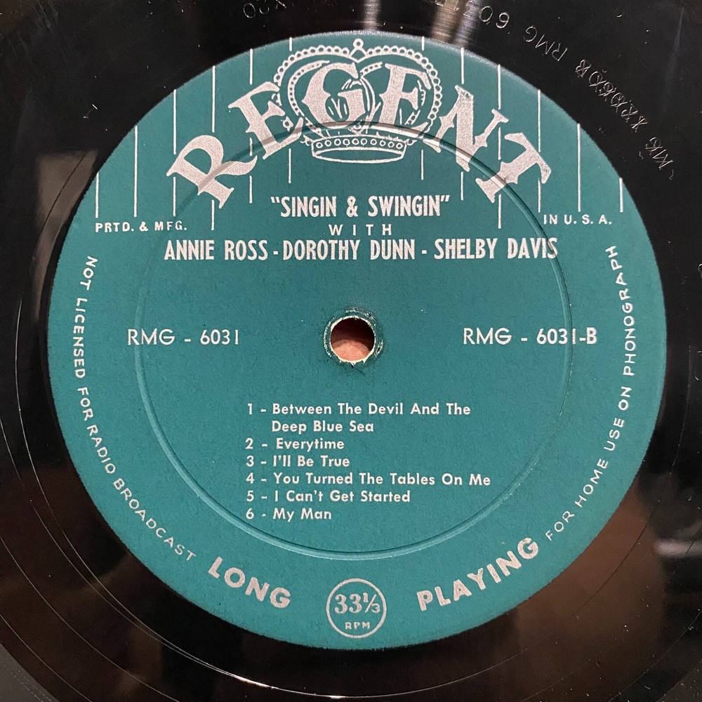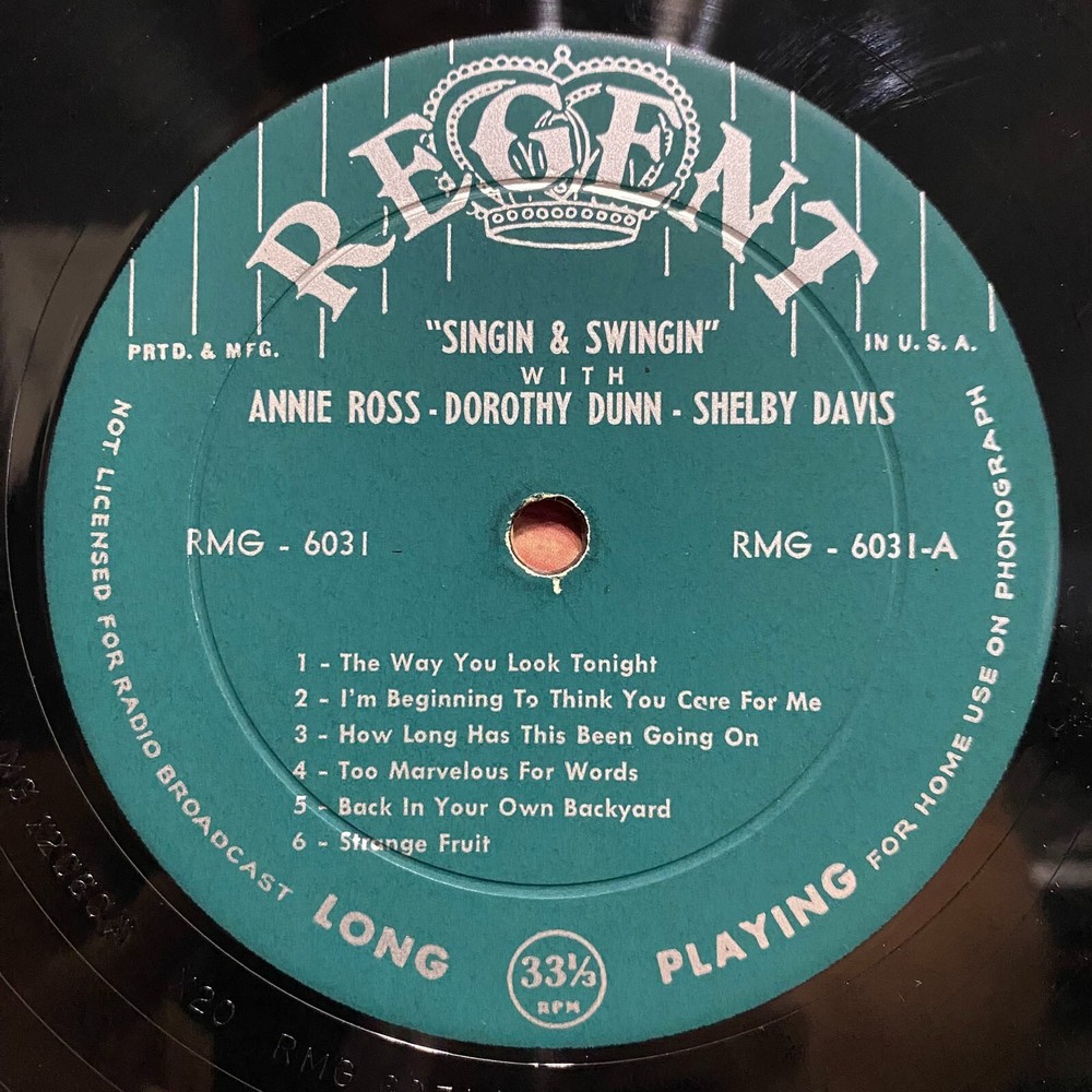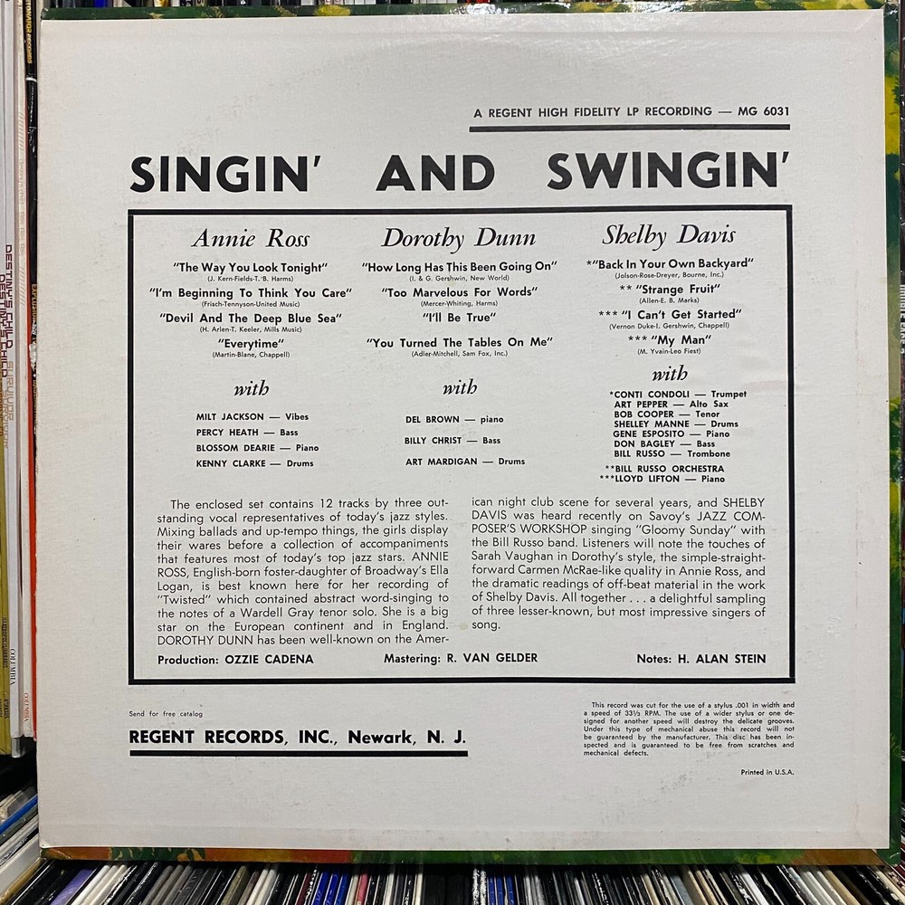 ARTIST Annie Ross , Dorothy Dunn , & Shelby Davis TITLE Singin' 'N Swingin' LABEL Regent Records CATALOG # MG 6031 YEAR 1956 FORMAT Vinyl LP PRESS STATUS OUT OF PRINT CONDITION Vinyl (A/B): VG+/VG+ | Cover: NM Scale: G- / G / G+ / VG- / VG / VG+ / NM- / NM / NM+ / M SONGS A1 The Way You Look Tonight A2 I'm Beginning To Think You Care For Me A3 How Long Has This Been Going On A4 Too Marvelous For Words A5 Back In Your Own Backyard A6 Strange Fruit B1 Between The Devil & The Deep Blue Sea B2 Everytime B3 I'll Be True B4 You Turned The Tables On Me B5 I Can't Get Started B6 My Man PHOTO DETAILS Released in 1956, this album is now long out of print and is impossible to find on vinyl these days. Comes in full picture sleeve as shown above! Don't sleep... you won't see this rare gem again!! Grab it today before it's gone!! **Be sure to check my eBay Store for more bomb music releases!!**