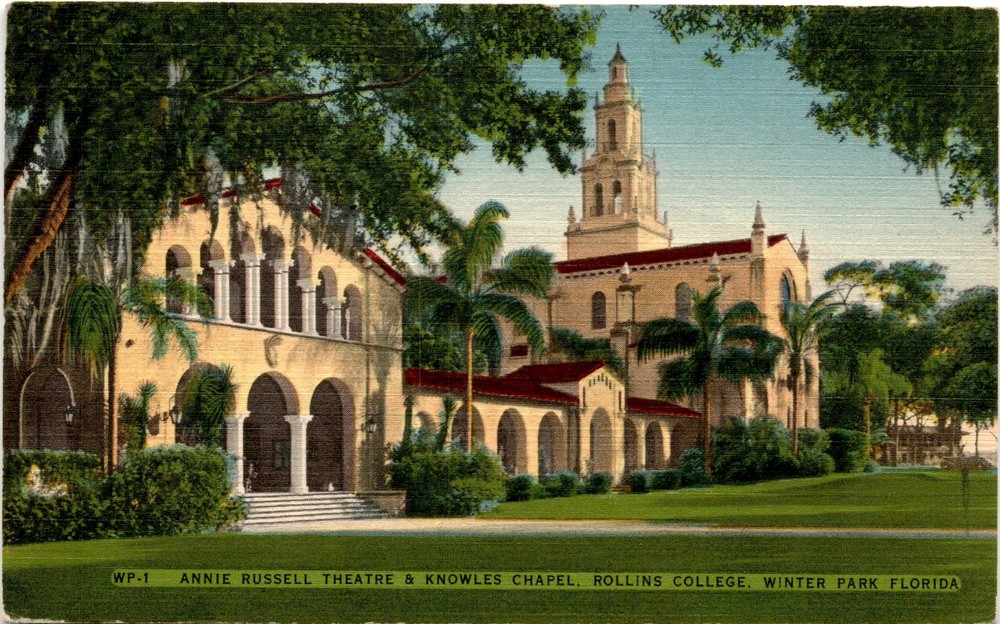 The postcard features a photograph of the Annie Russell Theatre and Knowles Chapel at Rollins College in Winter Park, Florida. The Annie Russell Theatre is a prominent building on the Rollins campus, dedicated in 1932 and known for hosting college dramatic productions and notable visiting attractions.