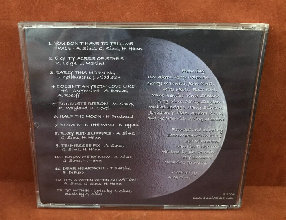ANNIE SIMS CD ~ HALF THE MOON ~ ~ OUR CDS ARE SHIPPED IN A BUBBLE ENVELOPE PROTECTED BY CARDBOARD ~ ** FEEDBACK VERY IMPORTANT TO US ~ WE GLADLY LEAVE FEEDBACK AFTER WE RECEIVE IT SO WE KNOW YOU WERE SATISFIED WITH YOUR PURCHASE ** _____________________________ Payment Information: Payment on items won is due within 4 days of item ending. If we do not receive payment within this time we reserve the right to relist the item and a non-paying complaint will be filed with Ebay. Shipping Information: Shipping costs vary depending on the item, please refer to the shipping section adjacent to pricing information for your exact shipping cost. We will combine shipping on multiple purchases, please wait for your invoice if you have won multiple items. If multiple items are paid for individually there will be no refund on shipping charges. Shipping price listed is for within the United States. We will choose shipping company based on weight and buyers location. All duties, tariffs, import fees and taxes are the responsibility of the buyer. We take great pride in quick shipments and packing your order safely. Return Information: All returns must be approved, we can only accept returns for an item that was not described correctly. We DO NOT accept returns on sealed and brand new items - NO EXCEPTIONS. If a return is accepted, you are responsible for paying the shipping cost to return the item to us. All items must be returned in the same condition as received and seen in listing photos. Refunds will be calculated for the amount paid for the item only. We do not refund original shipping cost. Thanks for looking at our items!!