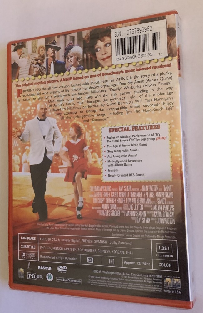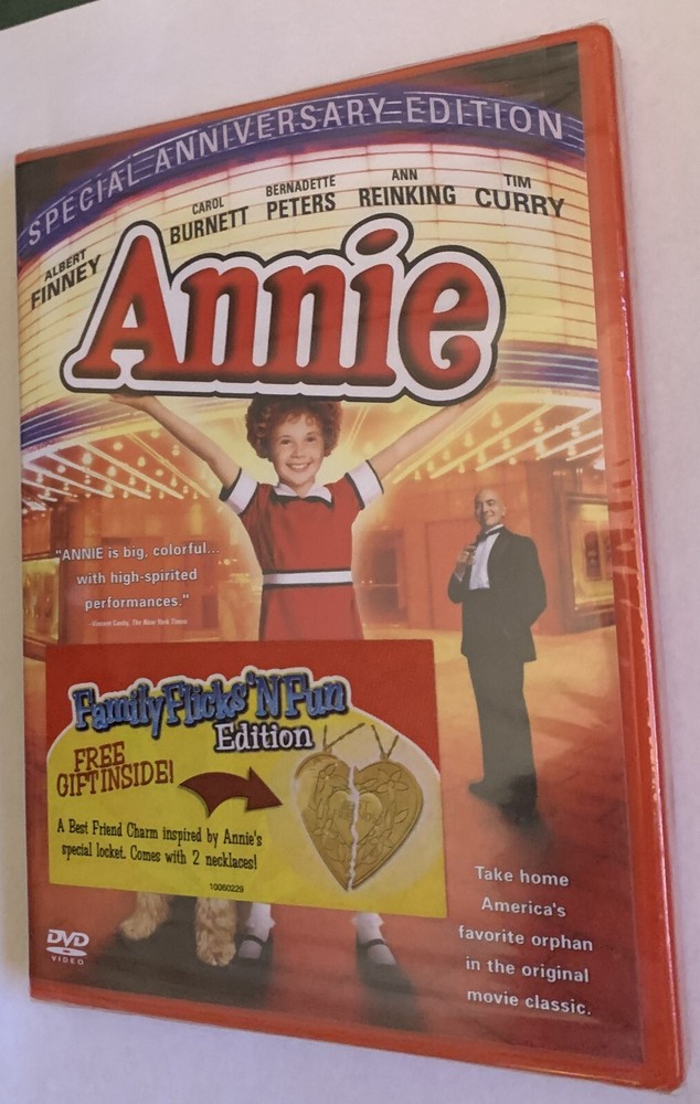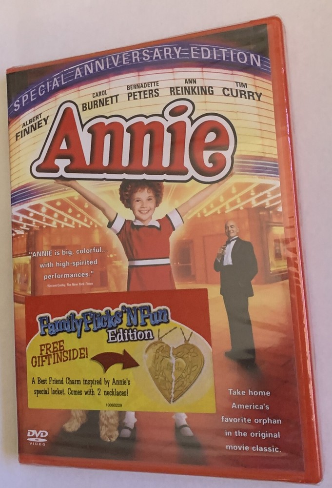 NEW AND SEALED, REGION 1, FULL SCREEN DVD ANNIE SPECIAL ANNIVERSARY EDITION. FAMILY FLICKS'N FUN EDITION. FREE GIFT INSIDE A BEST FRIEND CHARM INSPIRED BY ANNIE'S SPECIAL LOCKET. COMES WITH TWO NECKLACES. Based on one of the most popular comic strips of all time and adapted from the smash Broadway musical, Annie is set in Depression-era New York City, where a spunky little girl (Aileen Quinn) lives in an orphanage run by the boozy, tyrannical Miss Hannigan (Carol Burnett). Annie's hopes soar when multigazillionaire Oliver Warbucks (Albert Finney) decides to take in an orphan for a week to "upgrade his image." She gets herself chosen, gradually Annie and her adopted dog, Sandy, ingratiate themselves, and eventually Warbucks adopts the girl. But his search for Annie's missing parents turns up only the villainous Rooster (Tim Curry) and his venal girlfriend, Lily (Bernadette Peters), who conspire with Miss Hannigan to relieve Warbucks of both the girl and a hefty reward. It is left to Sandy, the other orphans and Daddy Warbucks to rescue Annie before it's too late. Enjoy all the unforgettable songs, including "It's A Hard Knock Life" and "Tomorrow." FREE PRIORITY MAIL SHIPPING WITH TRACKING NUMBER AND DELIVERY CONFIRMATION. GOOD LUCK AND HAPPY BIDDING. PLEASE CHECK OUT MY OTHER AUCTIONS.