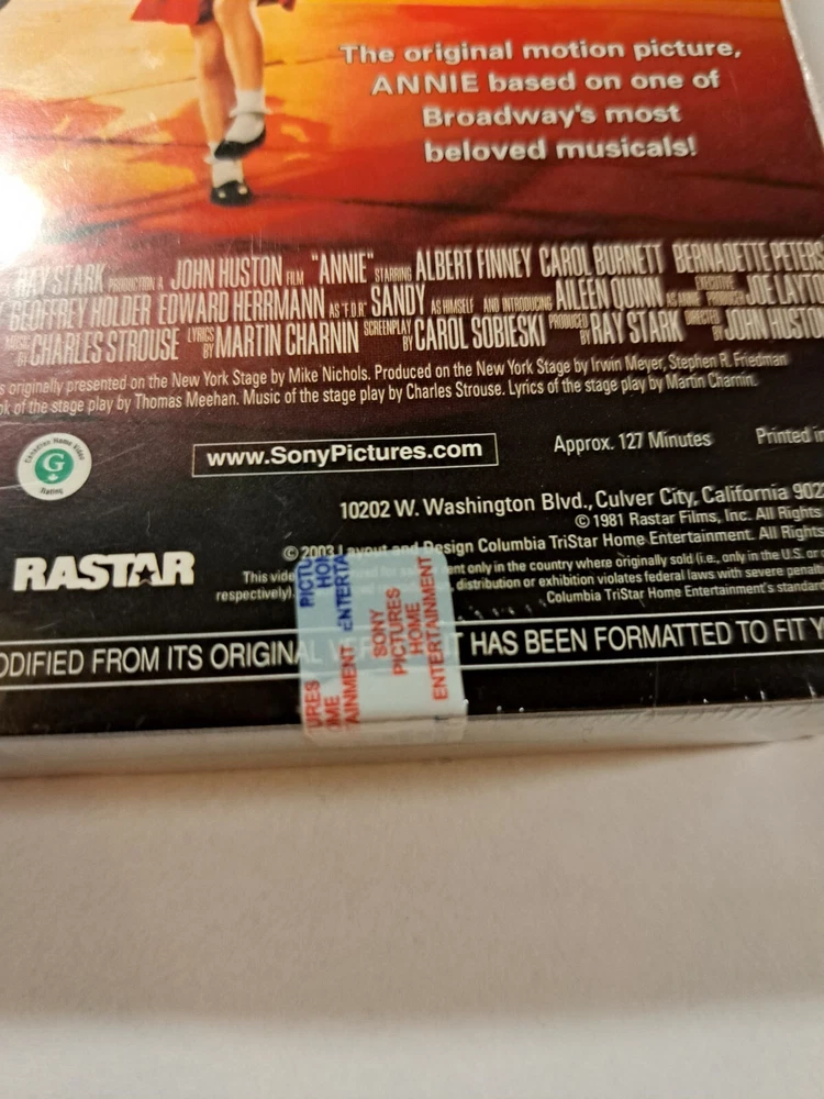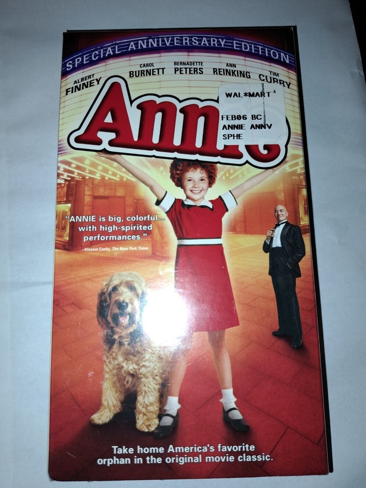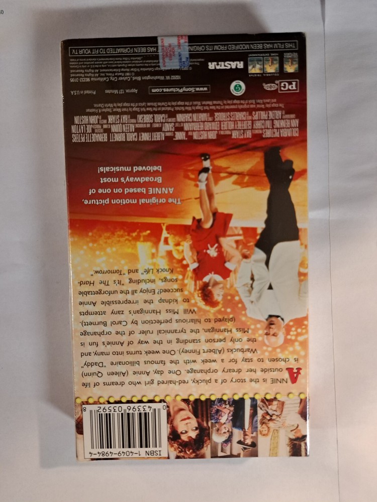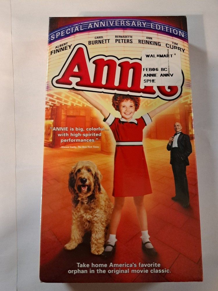 This VHS tape is a must-have for fans of the classic musical Annie, directed by John Huston. Featuring Aileen Quinn and Carol Burnett in leading roles, this Special Anniversary Edition is in brand new condition and still sealed. The DVD edition year is 1994 and the signal standard is NTSC, with a rating of G. This tape is sealed and new old stock and falls under the sub-genre of musicals. The studio responsible for its release is Live Home Video, with no modifications made to the original version. the language is English. The movie is categorized under Musicals, Broadway and Musical & Performing Arts, and was produced in an unknown country/region of manufacture.