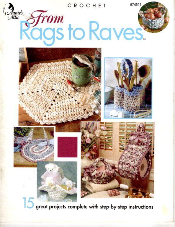 ANNIE'S ATTIC CROCHET FROM RAGS TO RAVES 15 GREAT PROJECTS X Click to Enlarge X Click to Enlarge You are buying a Annie's Attic From Rags to Raves crochet pattern leaflet. Leaflet is in good condition. Designs are: A Well-Dressed Table- Place mat & napkin ring Country Kitchen - Rug, Hot Pad, Wall Hanger, and Napkin Holder Rag Fruit Basket Oval Rug Bath Duo- Basket, and Toilet tissue holder Country Rag Cover Sugar and Cream Baby Basket Utensil Caddy Denim Bag All of my auctions are for the book, pattern or kit only and NOT the finished product . Information on this auction is listed above and if you have any questions on this item, Please contact me before you bid . Have a great day.... Payment is expected within 3 days after auction(s) end. The winning bidder will pay the listed amount for shipping above. Combining Multiple Auctions MULTIPLE WINS I DO REDUCE SHIPPING!!!Some exclusions apply: Lots of books, Hardcover books, Heavier Softcover books, Bead Kits and other certain items deemed by the seller. SEWING ENVELOPES, KITS, ANYTHING THAT IS NOT A BOOK CAN NOT BE SENT MEDIA, SO PLEASE DO NOT ASK!!!! We only ship with the United States Postal Service and we will decide on using Priority, First-Class, Postal or Media Mail. You must wait for a combined invoice for the discounted shipping on multiple wins. Other Items Feedback Contact eBay Store txzj pxzj27799 txzj-11 txzj70