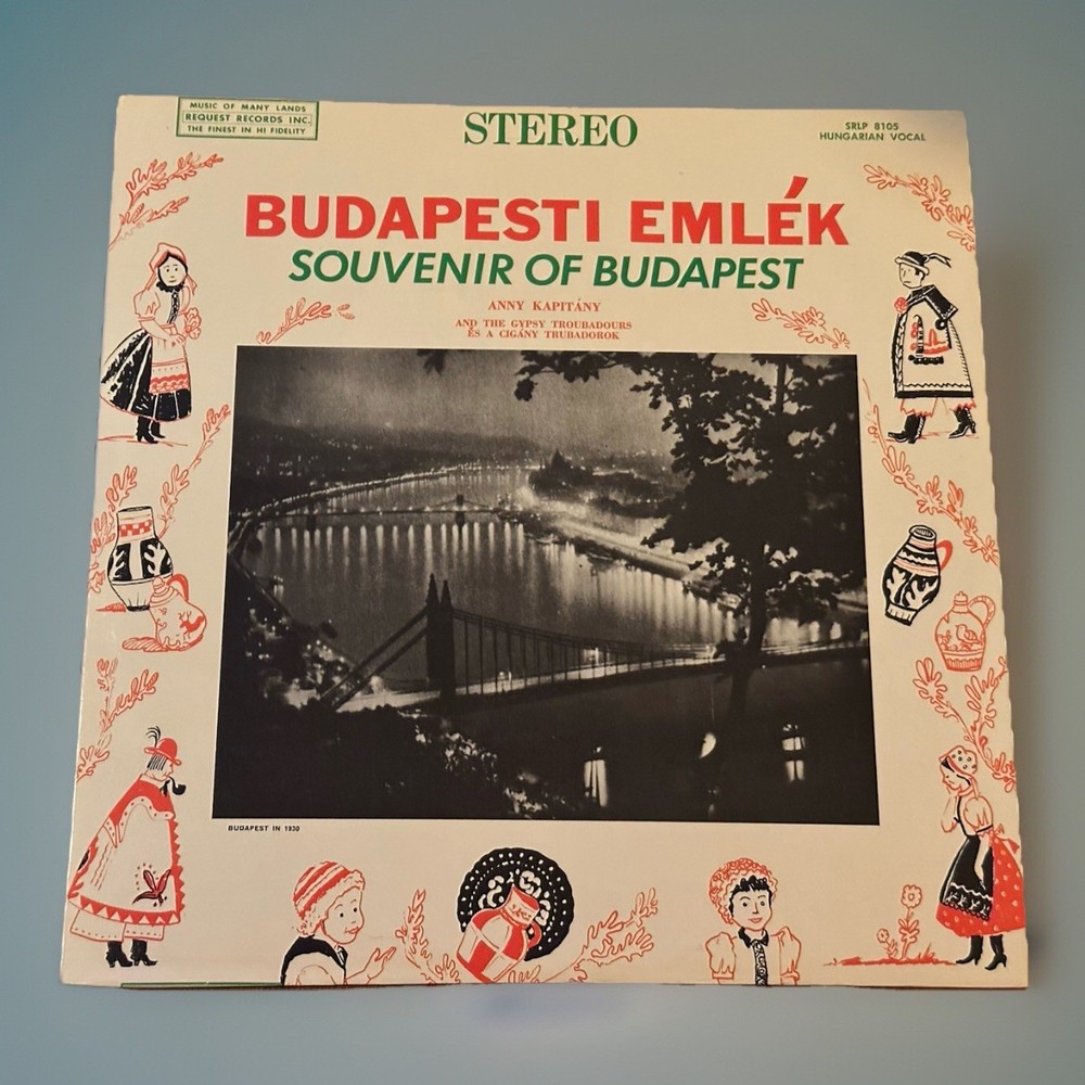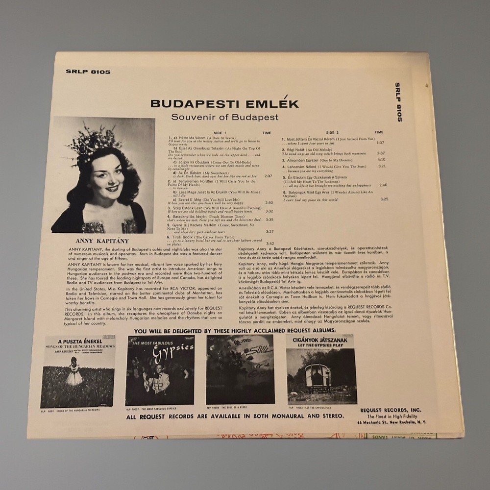 Enjoy the delightful tunes of Annie Kapitany with this vinyl record titled "Souvenirs de Budapest". This LP features world music genres and is an excellent addition to your vinyl collection. The record label is REQUEST and it was manufactured in the United States. The cardboard sleeve adds to the vintage feel of this import. The vinyl material is of high quality and the record grading is Excellent (EX). The sleeve grading is also Excellent (EX) and the inlay condition is great. This 12" record plays at 33 RPM and is a must-have for any music lover.