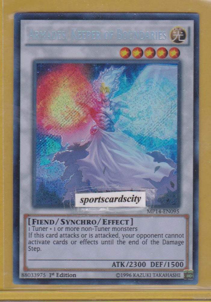 We will ship to Central and South America by Register Mail with tracking number only. Please do not bid if you don't want to pay for register mail with tracking. You are bidding on : 1 x Yu-Gi-Oh - : ARMADES, KEEPER OF BOUNDARIES (Secret Rare) (1st Edition) (Card # MP14-EN095) Cards are in stock and ready to ship. This card is an North Amercian Version by Konami. 100% Tournament Legal. ( This card is in Near Mint to Mint condition) Shipping & Payment Methods For Canadian: Shipping for the first card will be $1.49 . ( $11.99 Tracked Package is required on all orders over $60. ) For U.S Buyers: Shipping for the first 1 to 5 cards will be $4.99 (with tracking) . ($9.99 Priority Mail with tracked package is required on all orders over $100. ) Please contact us for combined shipping if interested in purchasing multiple cards before paying. additional $0.50 for each item after 5 cards. For international buyers: Excluding Central and South American and Israel Shipping for the first item will be $3.99 . ($24.99 Register mail with tracking number is required on all orders over $60. ) For Central and South America and Israel buyers : Shipping will be $24.99 flat, $0.50 for each additional item. All orders will ship by Register mail with tracking number only. ($0.50 for each additional item) Please wait for invoice before pay . Cards purchased are packaged with care and shipped in sleeve. double toploaders, team bag with an envelope to ensure safe delivery. Payment method : PayPal only We reserve our right to cancel any transaction or request to pay for register mail/express mail with tracking number for those : 1, Pay by an Non-Verified or Unregistered Paypal payment, 2, Request to ship to an Unconfirmed Paypal Shipping Address, 3, From an inactive Ebay account which has no activity for over 1 year. I will ship out your item(s) within 48 hours after payment is received. Your payment is expected within 5 days after auction. THANK YOU and HAPPY BIDDING! (stock # Binder - ) Powered by eBay Turbo Lister