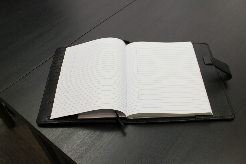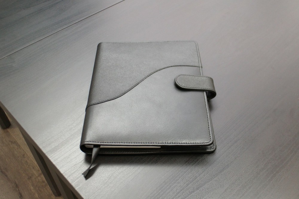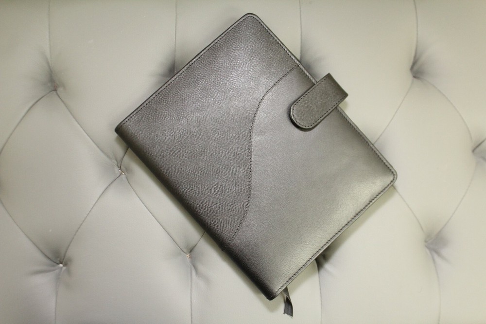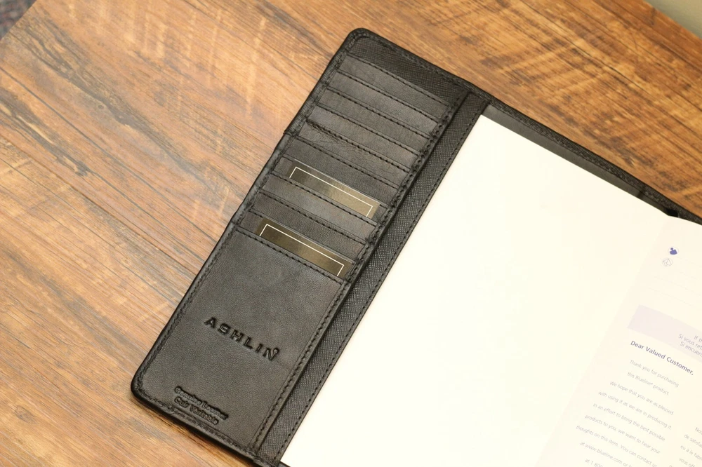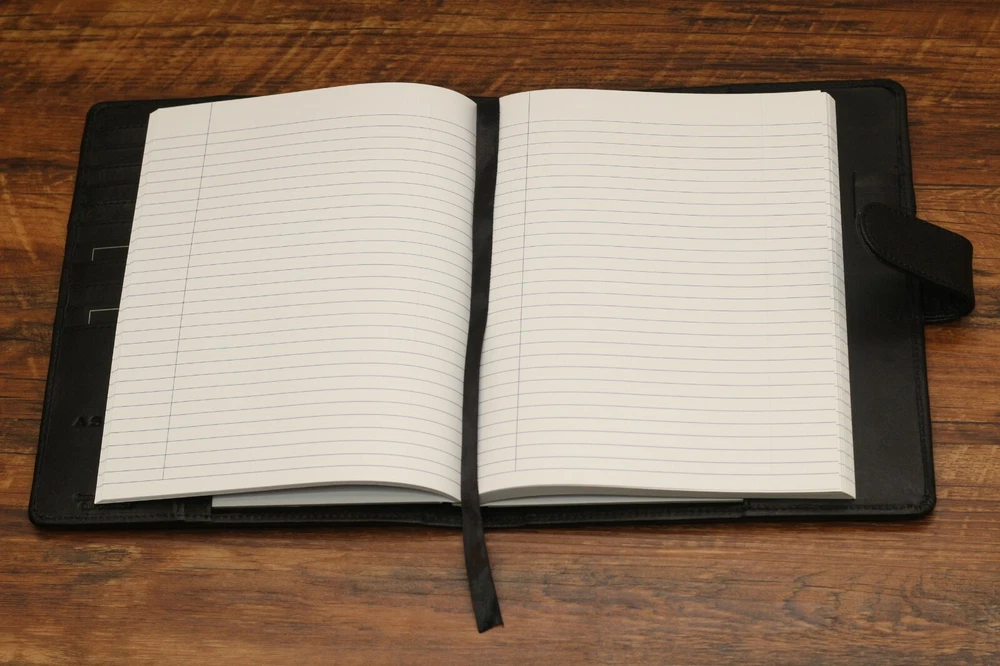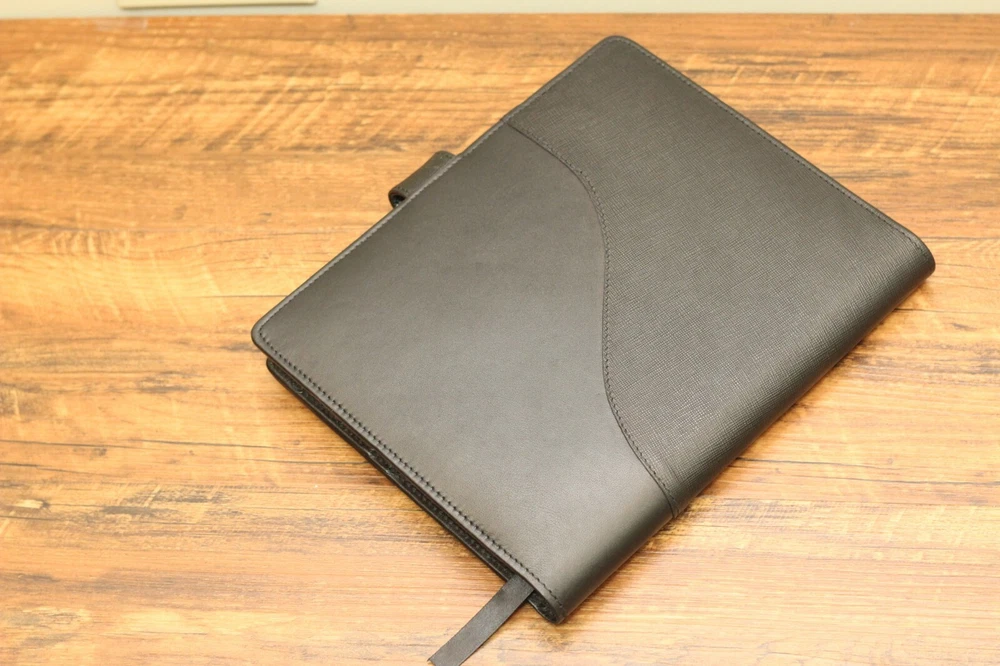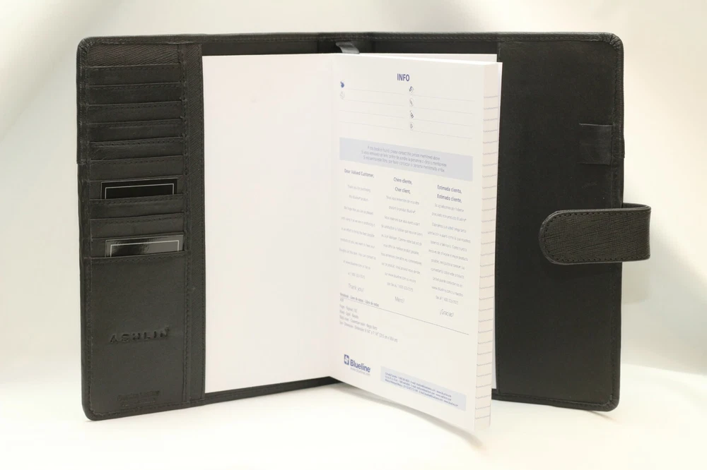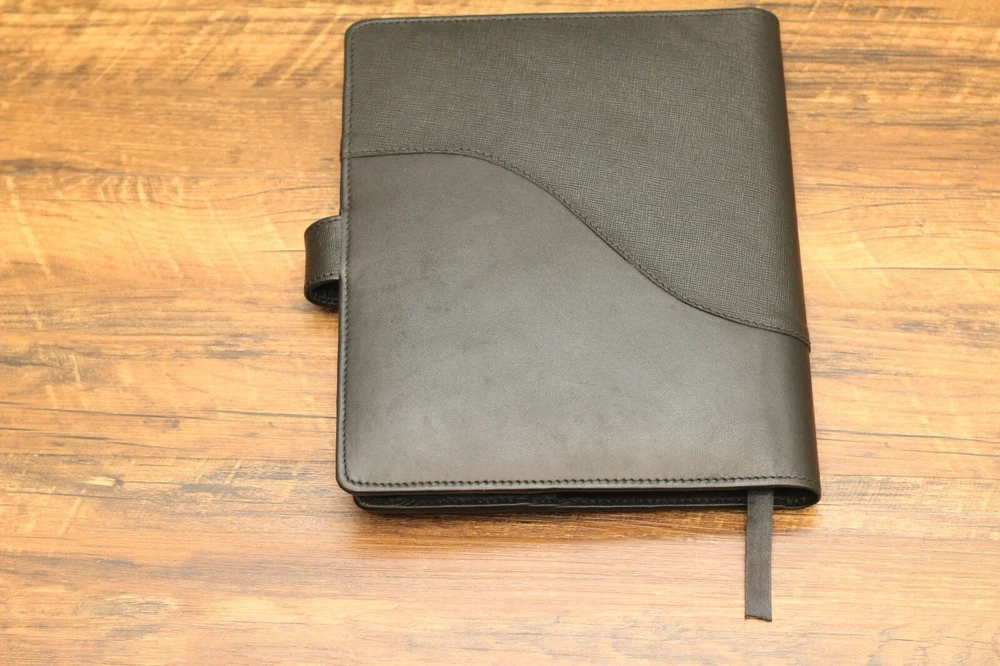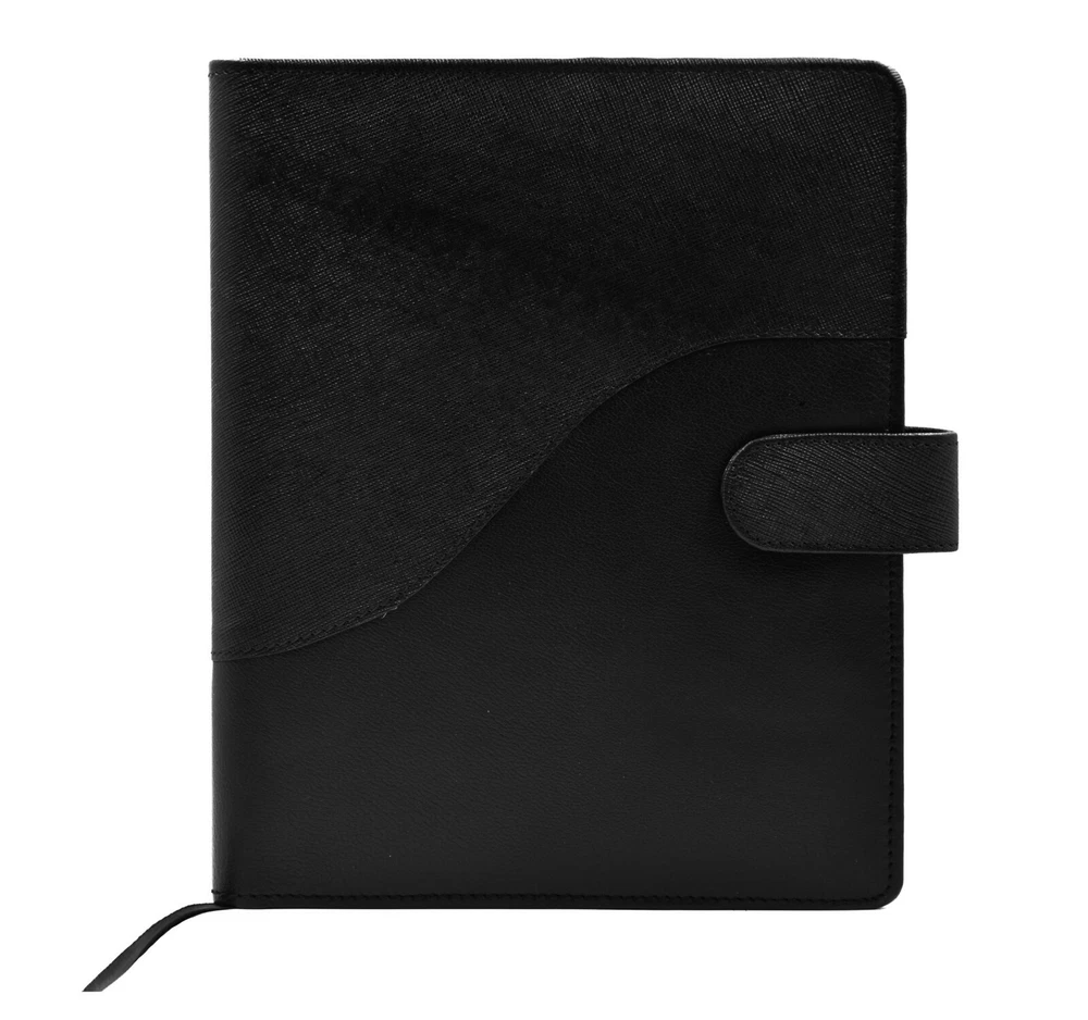 DESCRIPTION Our notebook journal is refillable with a magnetic closure. Perfect for your daily notes - take along when you attend your meetings or need to do journal writing. Includes the hard note book ( included ) - 192 page capacity. We sell the hard note book separately ( A19 - Blueline ). Carry this journal wherever you go so that you always have a place to jot your notes and write your thoughts. Leather: Tuscany Cowhide and Saffiano Leather Trim Colour: Black FEATURES: Tab and button closure for ease of use and security. Includes hardbound BLUELINE A19 removable journal, with 192 pages 7.25x9.25 Inches. Inside includes 11 business card pockets. Journal can be removed and replaced (BLUELINE JOURNAL A.19) Perfect size for your desk or briefcase. Featuring 100% Tuscany cowhide leather full grain leather. Our products are crafted from 100% genuine leather. This premium leather shows off a natural range of shades and textures. We use full grain leather, which is the ultimate quality in leather available.