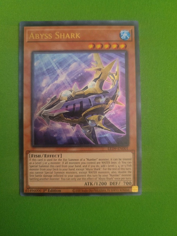 The Abyss Shark LED9-EN001 card is a highly coveted collectible in the Yu-Gi-Oh! TCG for its rarity as a 1st Edition ultra rare card. With its impressive attributes of water attribute, 1200 attack power, and 700 defense toughness, this card featuring a fish monster type from the Legendary Duelists: Duels from the Deep set is sure to be a valuable addition to any collector's deck. Manufactured by Konami, this English language card is a sought-after sought-after item for fans of the game looking to enhance their gameplay with a powerful and unique card.