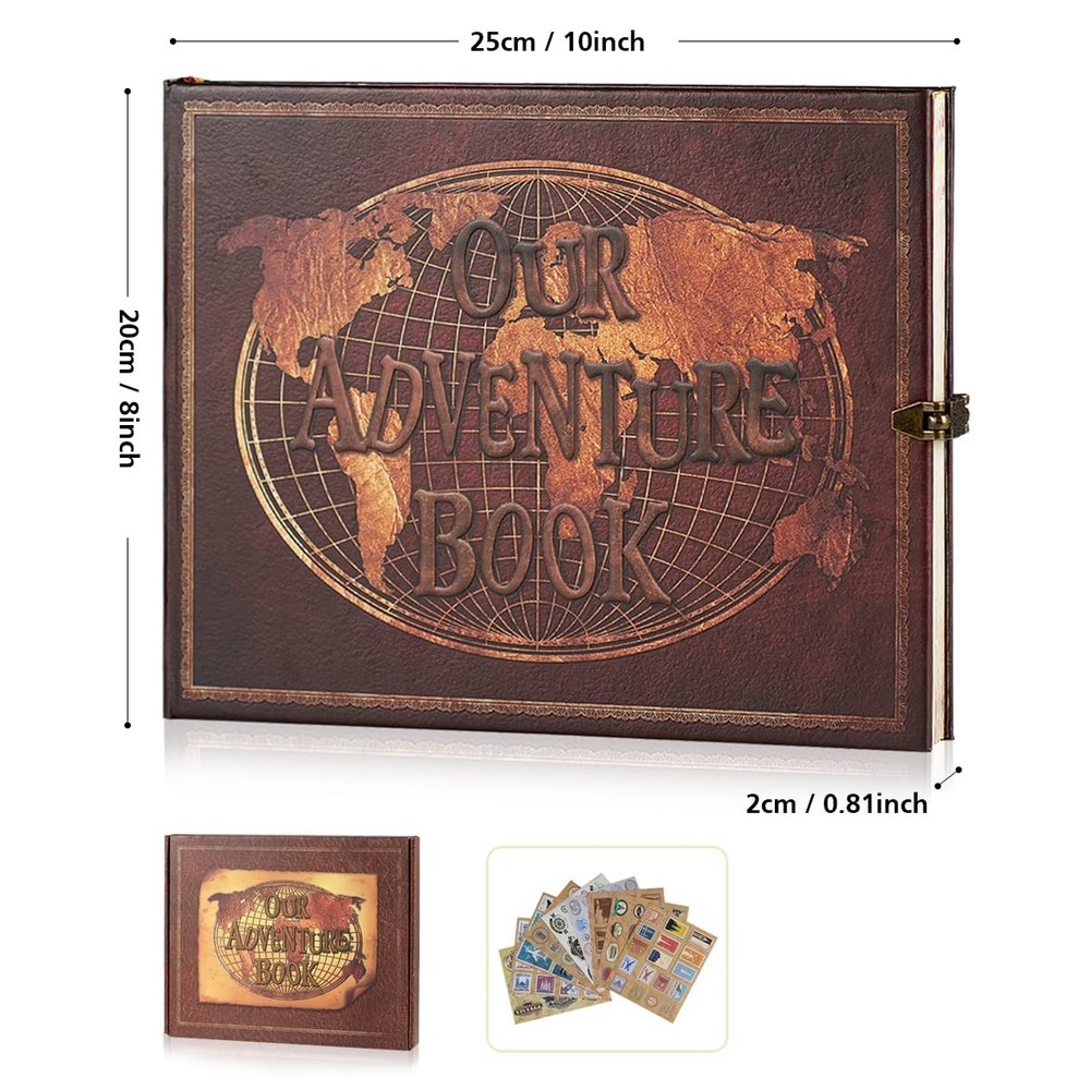 Product Description: Size & Features: The Adventure Book is sized at 10.2 x 8.1 x 0.9 inches, housing 90 sheets/180 pages. It includes a beautifully designed gift box, multiple stickers, and a sturdy craft paper bag for storing mementos such as stamps and travel tickets, catering to the sentimental collector.Additionally, this adventure book doubles as a notebook, featuring smooth, writable pages ideal for jotting down notes, thoughts, and memories with precision. It's perfectly suited for documenting your journeys within its pages. Quality & Design: Crafted with a durable cardstock cover and robust, colorfast kraft paper, this album is perfect for preserving memories and photographs long-term. The 3D embossed letter cover, along with the classic retro hardcover design made from thick, non-fading craft paper, hosts a variety of unique retro page styles for an artistic touch. Versatile & Gift-Worthy: Tailored for travel, this DIY adventure book serves as a compact travel journal and diary, fitting snugly in a backpack. It presents an adventure challenge for couples and doubles as an ideal anniversary photo album. The meticulous attention to artwork details, packaging, and customization makes it an exceptional gift for various occasions, including birthdays, Christmas, Thanksgiving, Mother's Day, Father's Day, and Valentine's Day. It's a perfect, heartfelt gift for best friends and couples looking to capture their shared memories. 🔥【Generous Size and Contents】The scrapbook measures 10.28 x 8.16 x 0.92 inches and includes 90 sheets/180 pages, accompanied by a gift box, stickers, and a practical craft paper bag on the back for storing stamps and travel tickets.Additionally, this adventure book doubles as a notebook, featuring smooth, writable pages ideal for jotting down notes, thoughts, and memories with precision. It's perfectly suited for documenting your journeys within its pages. 📷【Exceptional Quality】 Crafted with a durable cardstock cover, colorfast and thick kraft paper, ensuring the preservation of memories through long-term use. The album promises to safeguard and display precious photos effectively. 💯【Elegant 3D Design】 Featuring a 3D embossed letter cover and a classic hardcover style, made with thick, non-fading craft paper, each scrapbooking book contains various retro page styles for a nostalgic touch. 💎【Travel-Friendly Scrapbook】 Perfectly sized for on-the-go use, serving as a DIY adventure book, travel journal, and picture diary suitable for backpack storage. Additionally, it includes an adventure challenge for couples with a scratch-off feature and doubles as an excellent anniversary photo album. 🎁【Artistic Gifting】 This product stands out due to its impeccable artwork, detailed packaging, and customizable features, making it an ideal gift choice for various occasions including birthdays, Christmas, Thanksgiving, Mother's Day, Father's Day, and Valentine's Day. It's a perfect option for best friends, anniversaries, and as a memory book for couples.