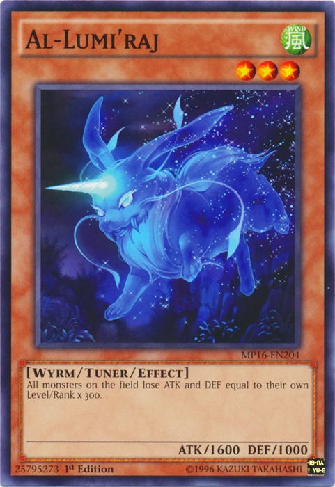 Al-Lumi'raj - MP16-EN204 - Common - 1st Edition Image is a stock photo of the card. You will receive the card in Heavily Played condition Condition: Heavily Played ATK/DEF : 1600 / 1000 Attribute : WIND Card Number : MP16-EN204 Card Rules : Card Text : All monsters on the field lose ATK and DEF equal to their own Level/Rank x 300. Card Type : Not Available Edition : 1st Level : 3 Monster Type : Wyrm / Tuner / Effect Name : Al-Lumi'raj Passcode : 25795273 Pendulum Scale : Rarity : Common Set : Be sure to visit our store for a wide selection of your favorite cards! We are running specials RIGHT NOW!! Shipping Options: ~Ships in a regular white envelope with a stamp for FREE! (THERE IS NO TRACKING INFORMATION AVAILABLE FOR THE ABOVE METHOD. SHIPPING TIME IS 4-10 BUSINESS DAYS) ~Ships in a TRACKEDbubble mailer for $5.99! ~Shipments are handled same or next business day. ~FREE SHIPPING for each additional card, so shop around our store!
