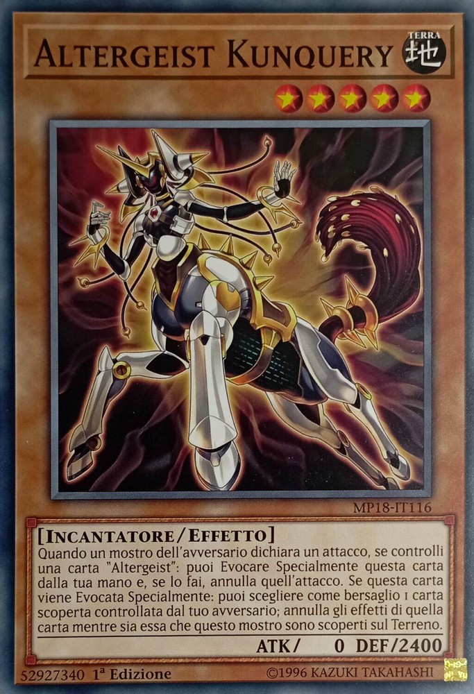 Altergeist Kunquery - Comune - Mega-Tin 2018 Mega-Pack - MP18-IT116 - Ita Nuovo Altergeist Kunquery - Comune - Mega-Tin 2018 Mega-Pack - MP18-IT116 - Ita Nuovo Quando un mostro dell’avversario dichiara un attacco, se controlli una carta “Altergeist”: puoi Evocare Specialmente questa carta dalla tua mano e, se lo fai, annulla quell’attacco. Se questa carta viene Evocata Specialmente: puoi scegliere come bersaglio 1 carta scoperta controllata dal tuo avversario; annulla gli effetti di quella carta mentre sia essa che questo mostro sono scoperti sul Terreno. Shipping Shipping cost: Italy Posta 1 -> 2,95 Corriere Espresso -> 5,99 Outside Italy Priority - 8,00 Delivery time: La Spedizione Viene Effettuata entro i 5 giorni successivi al pagamento dell'ordine. Payment Per qualsiasi info contattateci Service Per qualsiasi info contattateci