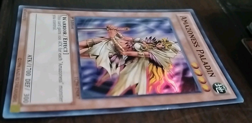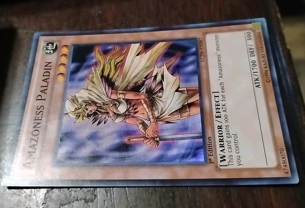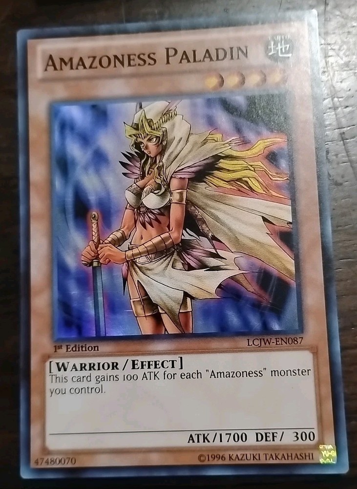 The Amazoness Paladin LCJW-EN087 card from the Legendary Collection 4: Joey's World 1st Edition is a super rare Yu-Gi-Oh! trading card manufactured by Konami. This Earth-themed Warrior card has a defense/toughness of 300 and an attack/power of 1700. It is an English language card featuring the Amazoness Paladin character, making it a valuable addition to any Yu-Gi-Oh! TCG collection. Its unique 1st Edition status adds to its appeal and collectible value.