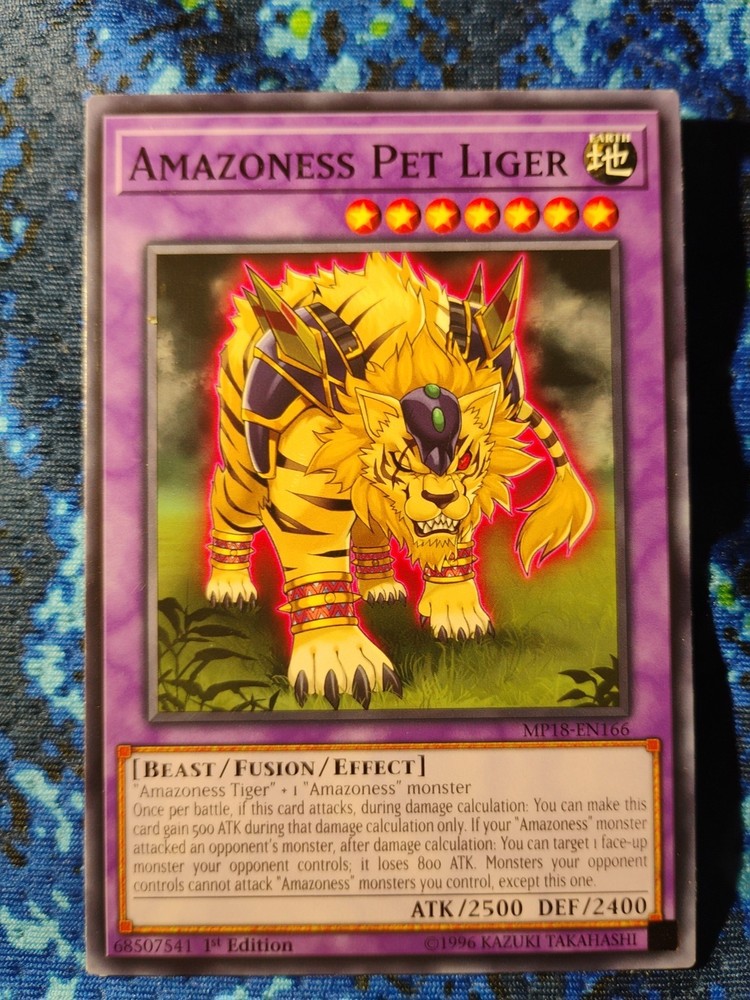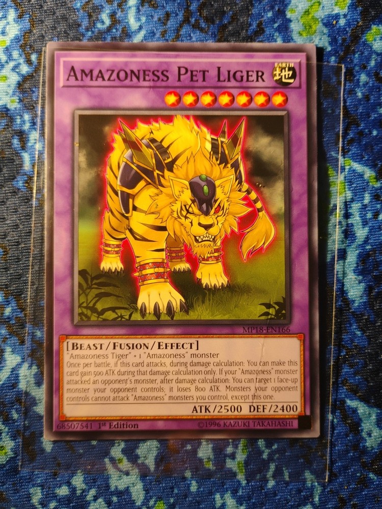 | Card Text | "Amazoness Tiger" + 1 "Amazoness" monster Once per battle, if this card attacks, during damage calculation: You can make this card gain 500 ATK during that damage calculation only. If your "Amazoness" monster attacked an opponent's monster, after damage calculation: You can target 1 face-up monster your opponent controls; it loses 800 ATK. Monsters your opponent controls cannot attack "Amazoness" monsters you control, except this one. |