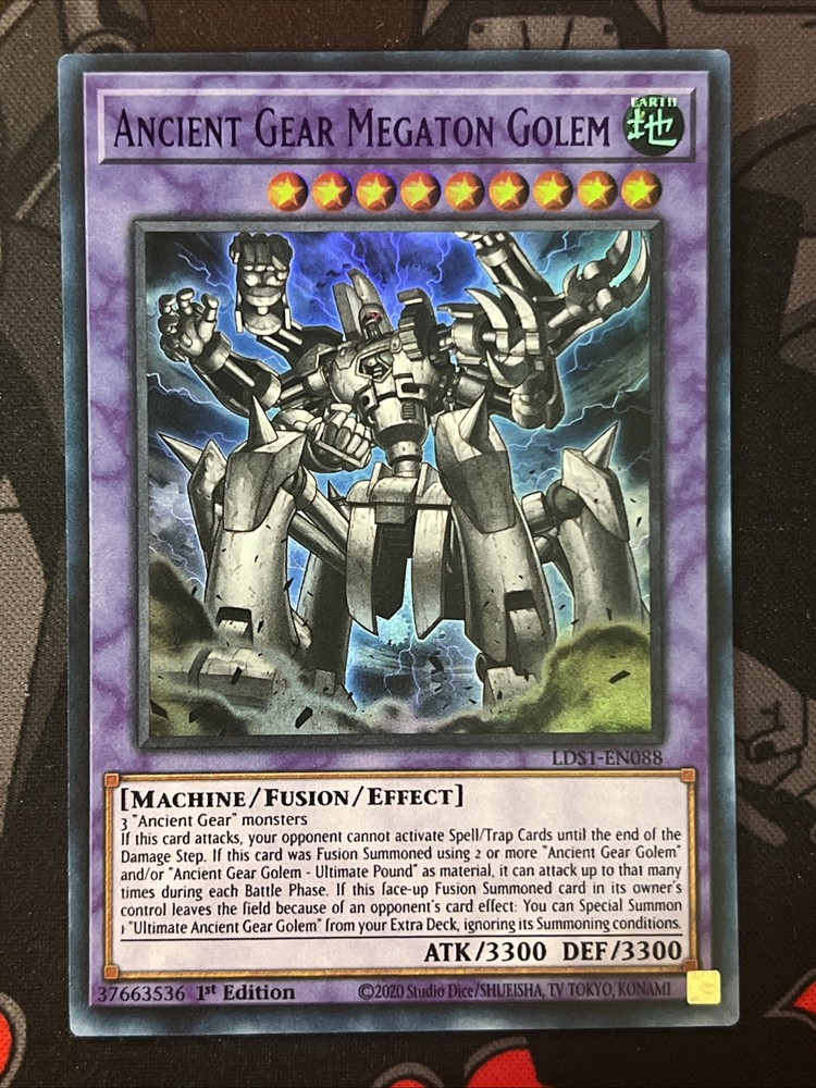 Enhance your Yu-Gi-Oh! TCG collection with the formidable Ancient Gear Megaton Golem, a must-have for any strategic player. Hailing from the Legendary Duelists: Season 1 set, this Ultra Rare card boasts the impressive card number LDS1-EN088 and is presented in its stunning 1st Edition release. Its unique Earth attribute and Machine creature type make it a powerful addition to any deck, capitalizing on its immense Attack/Power and Defense/Toughness of 3300 points each. Crafted by Konami and featured in English, this card is a true gem for collectors and competitive players alike. The Ancient Gear Megaton Golem's Effect and Fusion card types offer versatile gameplay options, ensuring it can be a pivotal component in your next victory. Add this impressive card to your arsenal and witness your opponents' reaction to this formidable Machine's might.