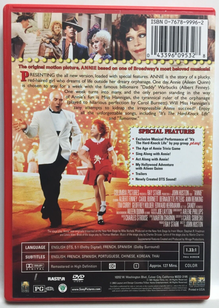 WANT IT A LOT CHEAPER?? HUGE SAVINGS!! If you are interested in Purchasing more than one of my over 5,000 Movies & CDs, SIMPLE!! Just Send Me a Message with the Items you Select and I will Make you a Wonderful Bundle Deal that you will probably not Pass Up, The More Items you Select the Bigger Deal you will Receive !! Annie [1982] (DVD,2003,Special Anniversary Edition) Aileen Quinn, Albert Finney, Ann Reinking, April Lerman, Bernadette Peters, Carol Burnett, Edward Herrmann, Geoffrey Holder, John Huston, Martika, Melissa Hayden, Meredith Salenger, Peter Marshall, Rosanne Sorrentino, Tim Curry Fantastic Disc (Soo Close to Mint), Case Lightly Worn, Look at Photos!! All My Items are 100% Guaranteed to Play Perfectly or your Money Back!! PLEASE VIEW PICTURES!! THEY SPEAK A THOUSAND WORDS!! ASK QUESTIONS BEFORE PURCHASING!! Optional USPS Ground Advantage Upgrade only $3.99!! (The USPS did away with First Class Package Service, This is what Replaced it) NOTE: The USPS has been having delays nationwide and have impacted delivery times on some orders 90% of all orders have no delays and arrive before the estimated delivery date The FREE SHIPPING expected delivery with tracking is normally 3-8 business days but IF delayed by USPS, orders may take much longer I ship all orders no later than the next business day after they are received Unfortunately, once shipped the delivery date is out of my control since I am no longer in possession of item PLEASE CONSIDER POSSIBLE USPS DELAYS BEFORE PURCHASING!!! I wanted to make all prospective buyers aware before ordering, that once I ship your item through USPS that I cannot do anything else to speed your package up! BUY A FEW,SAVE BIG! Promotions!! (Have to click on the promotion at the bottom of the page and has to be shipped to same address) SAVE $10 for every 4 items you Purchase OR SAVE $20 for every 7 Items you Purchase Have a Great Day!! Please check the pictures of the actual item for quality If Offered, There is no Guarantee that Digital copy code is not expired, used or even included What is pictured is what you get, Please ask questions if you need more information Don't be fooled by all the other listings with Stock Photos, Know what you are buying!!! Increase your Savings by purchasing More than One Item!!! I regularly have Promotional Offers that include a Substantial Discount for Purchasing more than one of my already heavily discounted Items. You will see these Promotional Offers at the top of most every one of my listings. All you have to do is click on the Promotional Offer and pick the additional Items you would like to capitalize on the great discounts described in the offer Save Money on Shipping!! If you're like me and you want your item shipped quicker than Media Mail, I have heavily discounted the quicker Shipping Methods for you on most Items!! So go ahead and get your Item SUPERFAST and save a load of CA$H as well!!!!