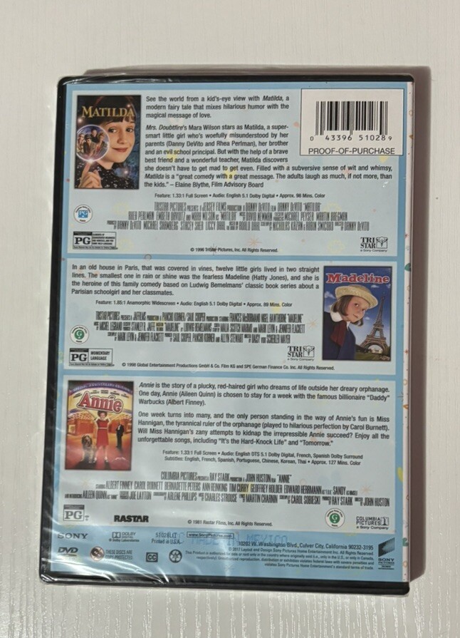 The product is a DVD featuring three family-friendly movies: "Annie" from 1982, "Madeline," and "Matilda" from 1996. The DVD has a total run time of 314 minutes and includes Spanish language audio with multiple subtitle options. Released by Sony Pictures, this DVD is ideal for those who enjoy family-live action films in Spanish.