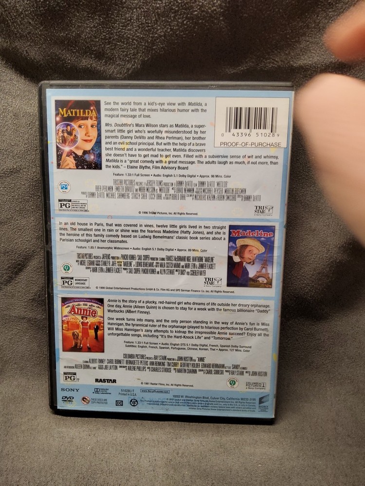 This DVD features three beloved children's classics: Annie (1982), Madeline, and Matilda (1996). With a total run time of 314 minutes, this DVD is perfect for a cozy family movie night. The films are presented in Spanish with subtitles available in Chinese, English, Korean, Portuguese, Spanish, and Thai. The DVD is in the format of a DVD and was released by Sony Pictures in 1996. The genre is family-live action. Enjoy these heartwarming stories of adventure, friendship, and bravery.