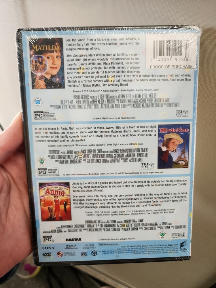 This DVD set is a nostalgic gem! Perfect for fans of classic family films—Annie’s charm, Madeline’s adventures, and Matilda’s wit make it a fantastic trio. The discs arrived in great condition, and though details were sparse, the movies play flawlessly. A must-have for movie nights with kids or anyone who loves timeless stories!