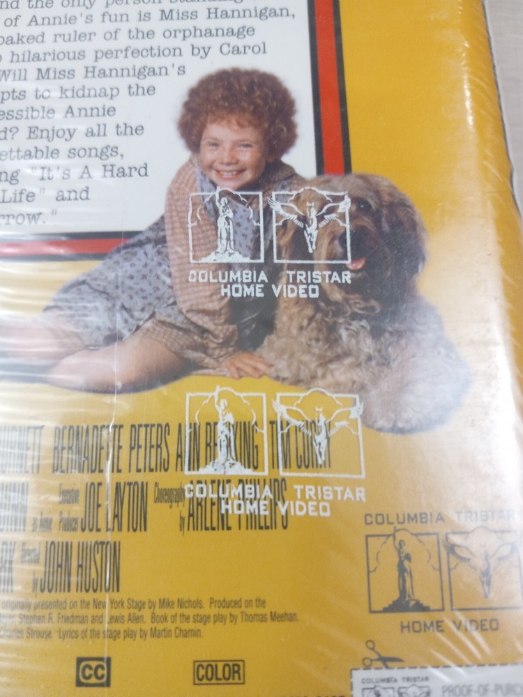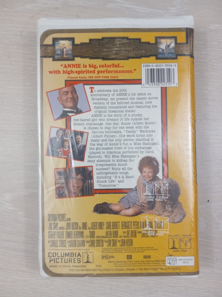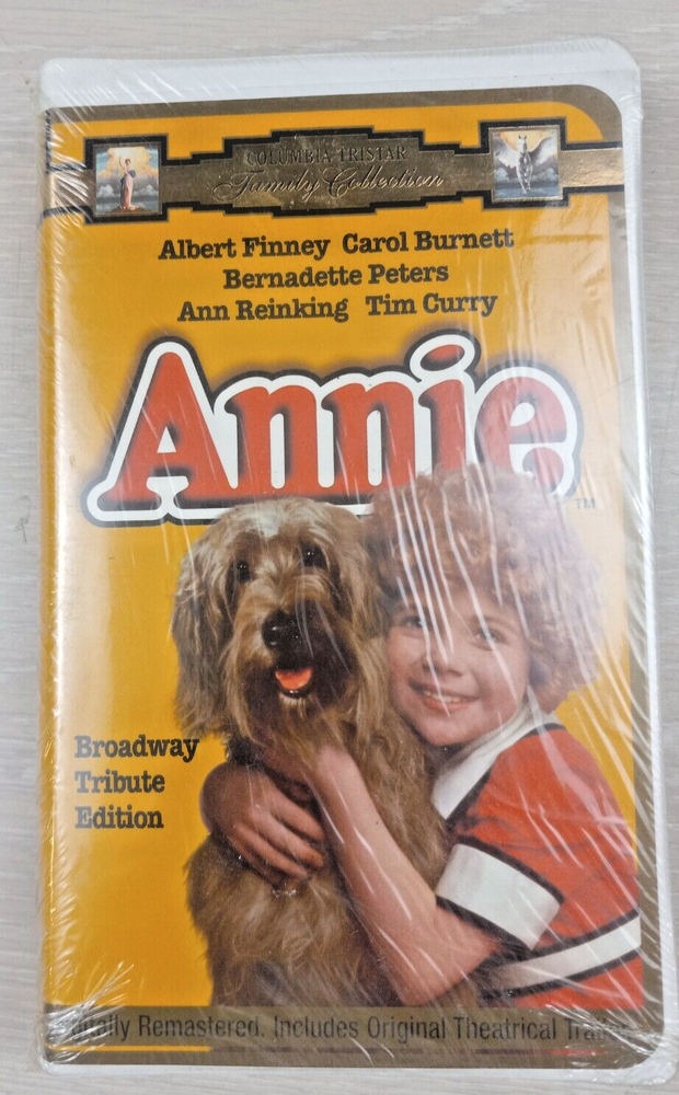 The "Annie" VHS tape is the 1997 Broadway Tribute Edition in a sealed clam shell case. Starring Albert Finney, the film is a comedy musical in the Children's & Family genre. It is in English with NTSC signal standard, rated PG. Produced by Columbia Pictures, this version is not a former rental and was made in the United States. The tape is a special edition dedicated to the Broadway production of "Annie."