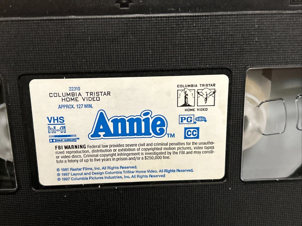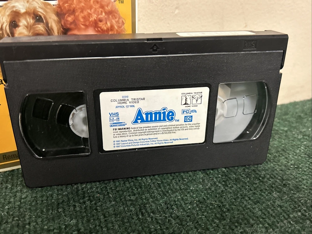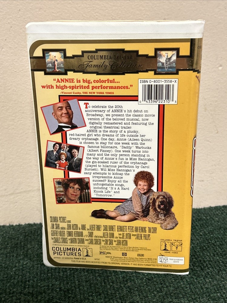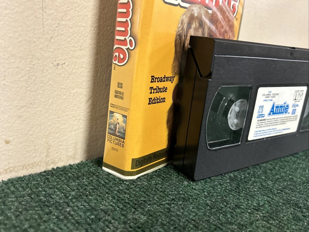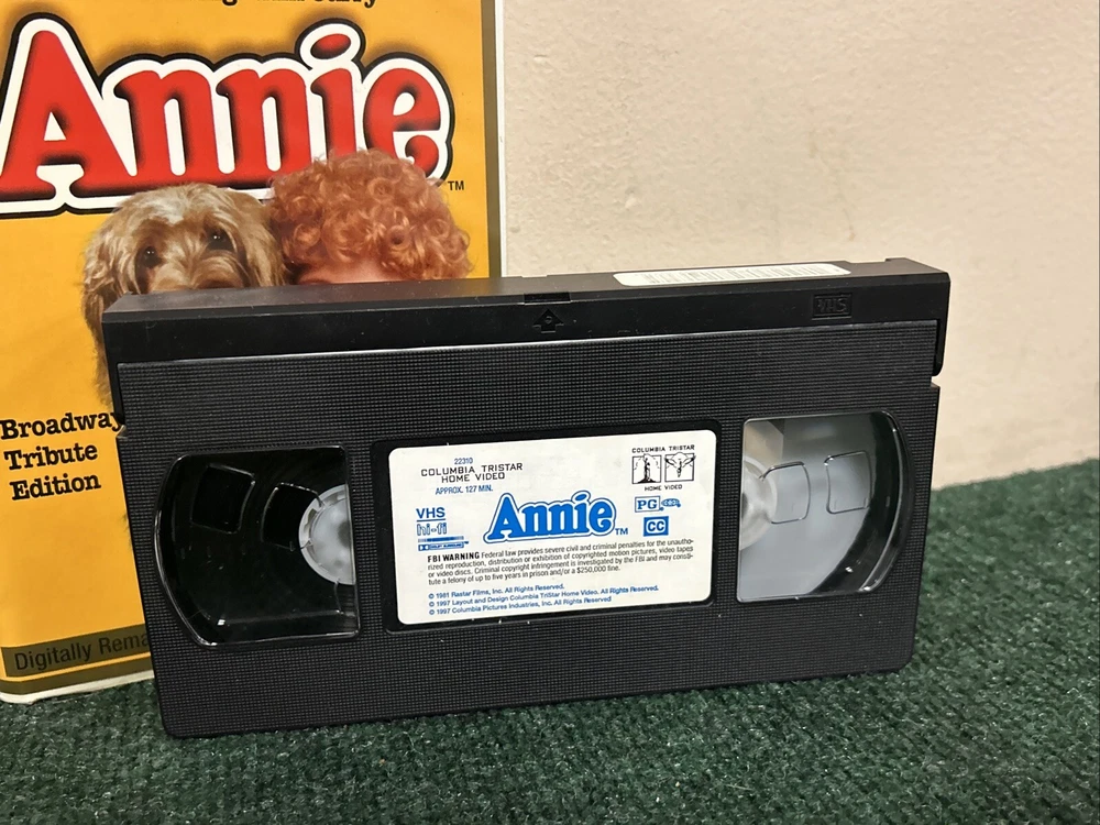 Title: Annie (1997) Broadway Tribute Edition - VHS Clamshell Case Description: Condition: Pre-owned in good condition. The VHS tape and clamshell case show minor signs of wear but are well-preserved overall. Product Details: - Brand: Columbia Pictures - Model: VHS Tape - Item Name: Annie (1997) Broadway Tribute Edition - Format/Type: VHS Tape - Category: Family, Musical, Classic Films - Year: 1997 - Label/Manufacturer: Columbia Pictures - Features: Starring Aileen Quinn, Carol Burnett, Albert Finney, and Bernadette Peters. Directed by John Huston. Celebrating the 20th anniversary of Annie's hit debut on Broadway, this digitally remastered version includes unforgettable songs like "It's a Hard Knock Life" and "Tomorrow." - Dimensions/Size: Standard VHS size with clamshell case - Color: Multicolor - Country/Region of Manufacture: USA Summary: Celebrate the 20th anniversary of Annie's hit debut on Broadway with this special Broadway Tribute Edition VHS! This digitally remastered version of the beloved musical stars Aileen Quinn as the plucky red-haired orphan Annie, with Carol Burnett, Albert Finney, and Bernadette Peters. Enjoy all the unforgettable songs and heartwarming moments in this classic family musical. The VHS tape and clamshell case are in good condition, showing minor signs of wear but well-preserved overall. A must-have for fans of Annie and classic musicals. Shipping and Handling: Carefully packed and shipped within 1-2 business days. Tracking number provided. Additional Information: Feel free to reach out with any questions or requests for more information. Happy watching! 😊 Reference: VHS Box 5