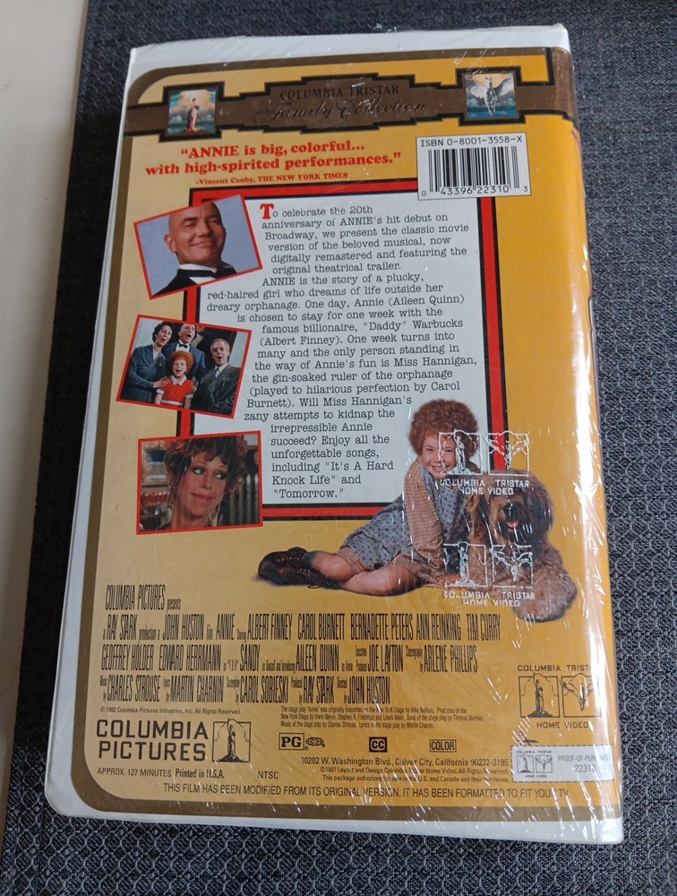 Experience the magic of Broadway with this Annie 1997 VHS Tribute Edition in a Clamshell Case. This special edition movie features the talented Aileen Quinn as the leading role of Annie, a little girl who charms her way into the heart of a billionaire. Directed by Ray Stark, this movie is a perfect blend of drama and comedy, making it an ideal addition to your movie collection. The movie is in English and has subtitles available. The package is new, sealed, and comes with watermarks. This musical & Broadway genre movie, produced by Columbia Pictures, is a must-watch for all movie lovers. Get your hands on this special edition today and immerse yourself in the world of Annie.