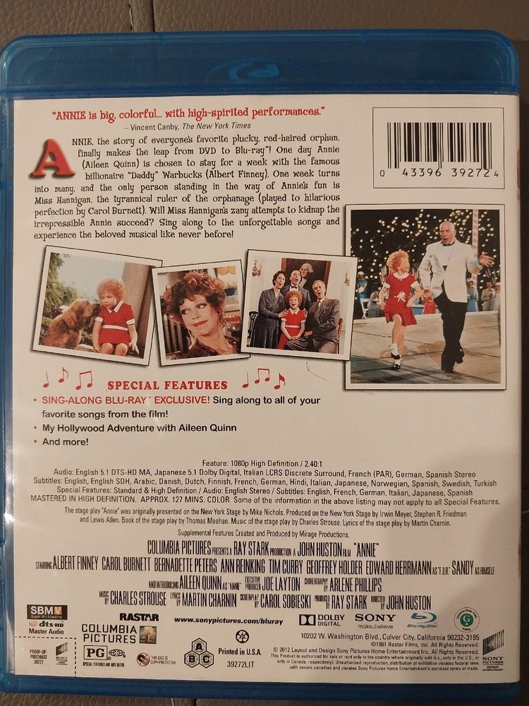 Annie: 30th Anniversary Edition Blu-ray. Kept in very good condition. Fast and free shipping is offered most anywhere in the U.S. Relive the magic of the classic musical Annie with the 30th Anniversary Sing-Along Edition on Blu-ray. Enjoy the heartwarming tale of the plucky orphan girl and her adventures with Daddy Warbucks without worrying about the item's condition. This edition comes sealed and includes subtitles in Danish, English, Finnish, French, German, Hindi, Italian, Norwegian, Spanish, Swedish, and Turkish, making it perfect for a family movie night. With a star-studded cast led by Carol Burnett and directed by John Huston, this musical gem is a must-have for any movie collection.